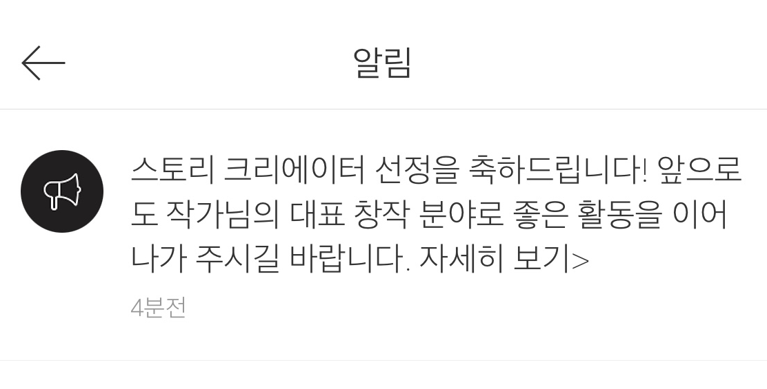 여느 때와 다름 없이 지루한 평일 낮 시간을 보내던 도중, 브런치 알림이 떴습니다. 종종 오는 전체 공지겠거니 하고 스윽 훑었는데 이게 웬걸, 제가 스토리 크리에이터가 되었다니요?