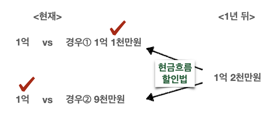 현금흐름 할인법에 따라 계산한 1년 뒤의 1억 2천만원이 오늘의 1억 1천만원과 같다면(경우①), 오늘 1억을 받는 것보다 미래의 1억 2천(즉, 오늘의 1억1천)만원을 선택하는 것이 이득일 겁니다.
