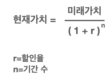 눈치가 빠른 분들은 이미 알아채셨겠지만, 이 현금흐름 할인은 복리 계산의 반대 개념이라고 이해하면 편합니다. 수식 역시 복리 계산의 식인 미래가치=현재가치(1+r)^n을 현재가치가 좌측에 오도록 이항한 형태이죠.