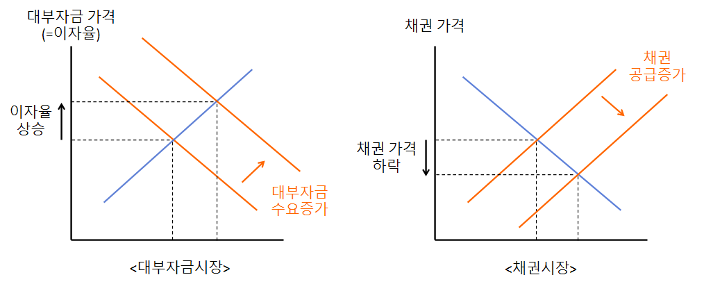 대부자금(돈)에 대한 수요가 올라가면, 대부자금시장의 수요곡선은 우측으로 이동하기 때문에 이자율은 상승한다. 동시에 돈이 필요한 기업은 채권 발행을 늘릴 것이므로 채권시장에서 공급곡선은 우측으로 이동하고, 채권가격은 하락한다. 대부자금 수요곡선의 우측 이동과 채권 공급곡선의 우측 이동은 동시에 발생하는 현상인 것이다.