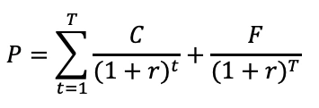즉, 각 시점의 이자지급액(C)과 액면가(F)를 시장이자율(r)로 할인한 현재가치를 모두 합한 금액이다.