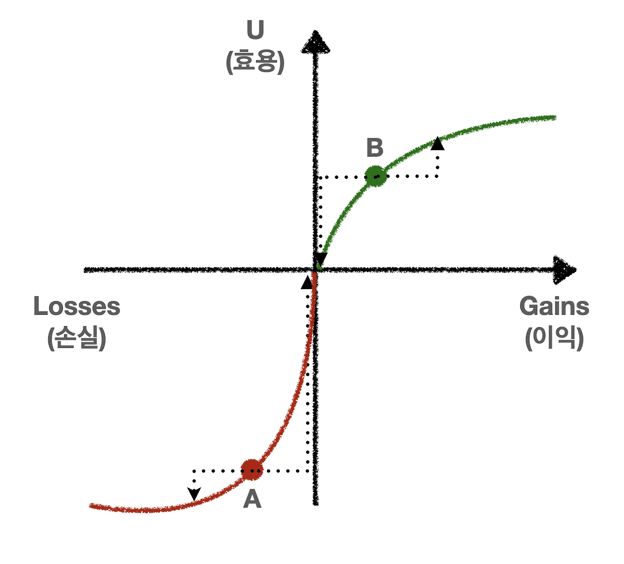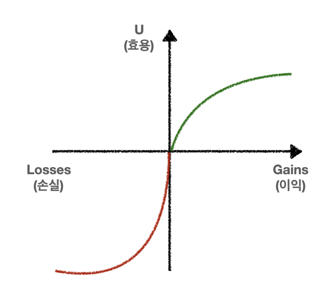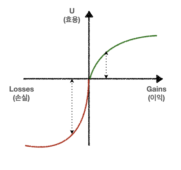 그래프의 원점에서 x축으로 각각 왼쪽(손실), 오른쪽(이득)으로 같은 크기만큼 움직일 때, y축에서 왼쪽(손실 )의 효용은 매우 큰 폭으로 감소하는 반면, 오른쪽(이득)의 효용 증가는 상대적으로 작은 폭으로 증가한다는 사실을 알 수 있습니다.