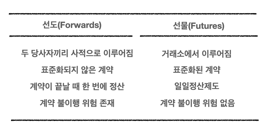 즉, 현재 시점에 ‘기초자산(무엇을), 만기(언제), 선도가격(얼마에)’ 세 요건을 미리 결정해놓는 거래라고 할 수 있죠.