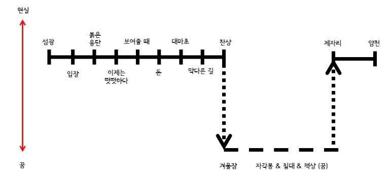 이제 2부의 이야기도 순차적으로 풀어보죠. 그는 자신이 받아들이지 못하는 현실의 규칙들에 대해 일단 대강 타협해두고선 모든 것을 컨트롤 할 수 있는 자각몽의 세계로 도망치려 합니다. 그러나 겨울잠의 뜻을 떠올려 봤을 때 이 도피가 단순한 자기위안에서 끝나지 않으리라는 점을 어렵지 않게 유추할 수 있습니다. 그는 균열의 원인인 돈과 엮인 여러 가지 사건들을 고통스럽게 되짚어보며 회복을 꾀합니다. 회상 끝에 그 동안 인식하지 못했던 내면에 억눌러온 모든 모순의 단서들이 책상 위로 모이고, 그는 마침내 길게 꼬인 모순의 매듭을 풀고 새 출발을 위해 꿈에서 다시 현실이라는 제자리로 돌아옵니다. 이제 1번 트랙부터 이 기나긴 자기탐험의 서사가 얼마나 섬세하고 정교하게 구성되어 있는지 천천히 살펴보겠습니다.