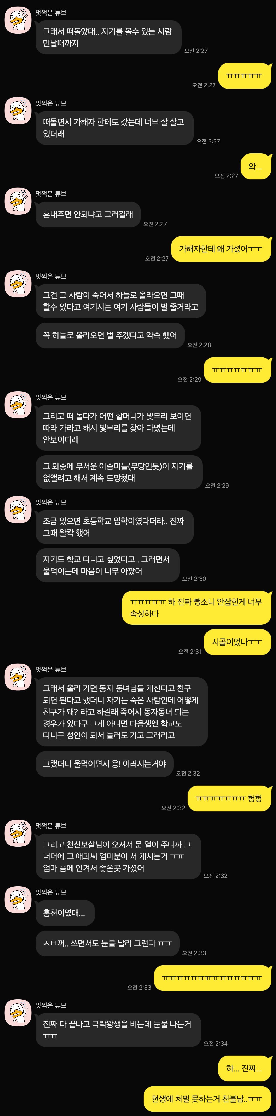 그리고 천신 할머니께서 아이를 올려보내 주었다는 말에 엄마를 만났으면 좋겠다고 말했는데, 다행히 엄마와 천사(*김보살에겐 빛나는 존재로만 보였기에 천사가 맞는지 모르겠지만 아이가 천사라고 했다고) 손을 잡고 가는 걸 봤다고 했다.