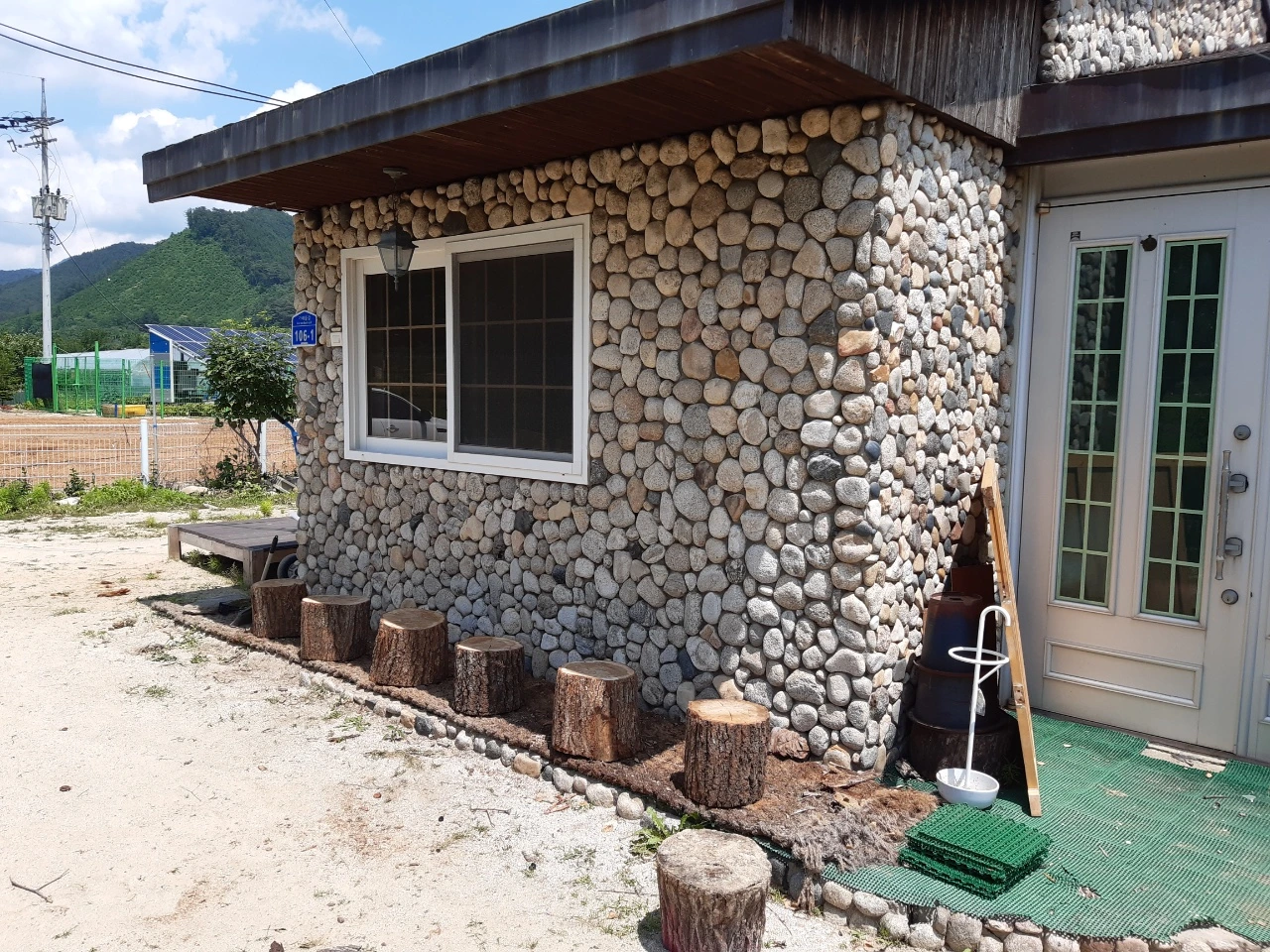 7;30 깔끔해진 돌 벽체가 나타났다. 전국의 강가 돌을 주워다 붙인 멋진 돌멩이들이 다시 아침을 만났다. 이리 멋진 집을...