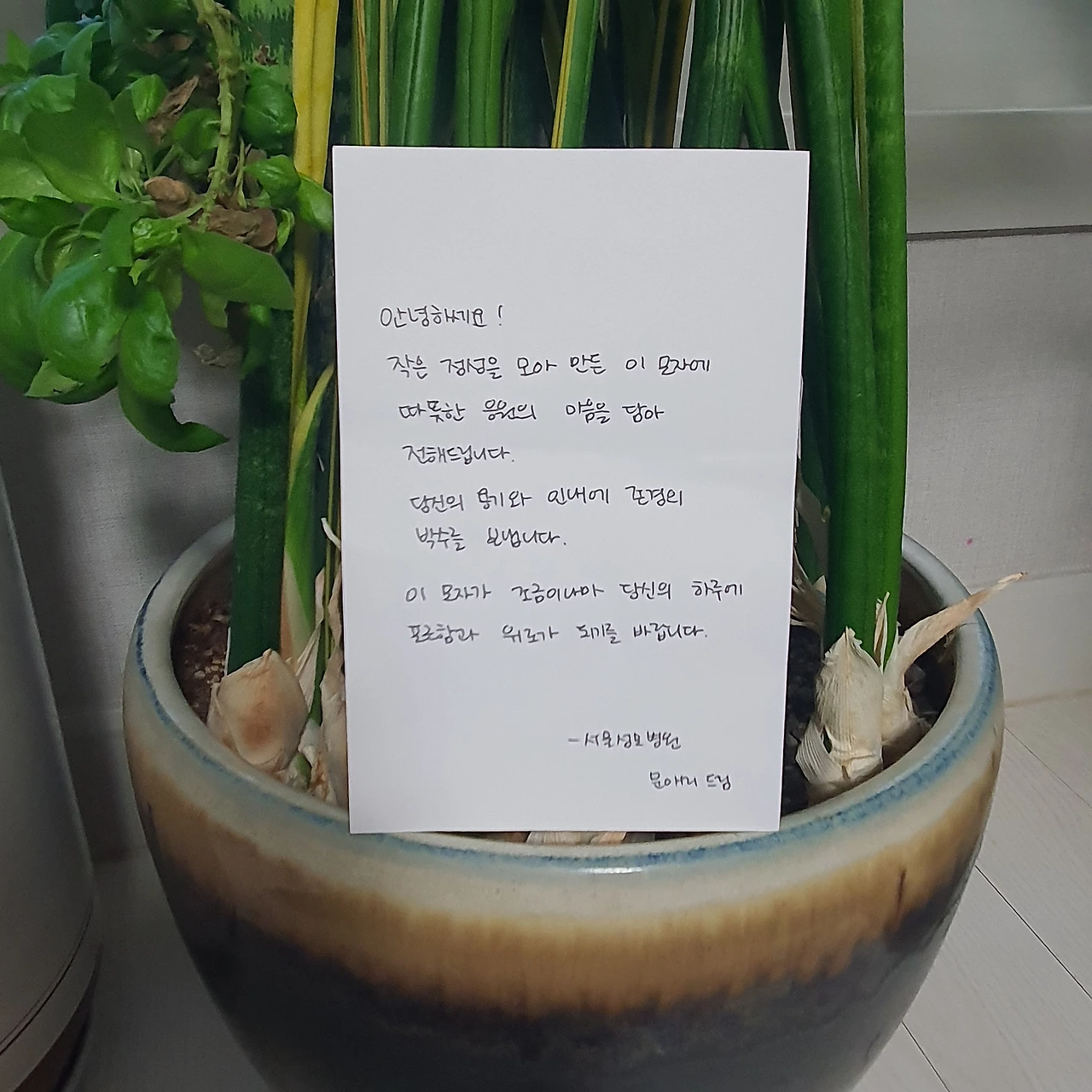 유방암 전문 간호사로부터 항암주사에 대한 전반적인 설명을 듣는다. A4용지 두 장 반이나 되는 안내서를 설명하느라 침이 마른다. 물이라도 떠다 주고 싶다. 설명을 마쳤는데 셀로판지로 포장이 된 밤색 털 모자를 덥석 안겨준다. 유방암 항암치료를 하면 머리카락이 빠질 것을 생각한 선물이란다. 측은지심의 눈빛, 공감의 눈빛에 얼어있던 맘이 녹는다. 아픈 사람을 만나는 직업을 가진 사람이 천부적으로 갖는 품성이 아닐까. 그런 맘이 없으면 일하기가 참 힘든 직업이다. 또다시 따듯해진다. 모자 안엔 예쁜 손 글씨로 항암치료를 잘 이겨내라는 격려 편지가 들어 있다. 서울 성모병원 문 애리라고 쓰여있다. 간호사인지, 직원인지, 그 누군지는 알 수 없으나 한 땀 한 땀 무늬를 놓았던 손길을 느낀다. 눈물을 안 흘리려고 작심했는데 결국 코끝이 빨개진다. 우리는 모르는 사람으로부터 선의를 느낄 때 감동한다. 착한 마음은 누구나 가지고 있다. 나는 그것을 믿는다. 알 수 없는 김애리 씨에게 감사의 마음을 전한다.