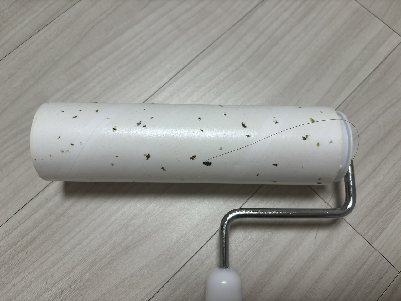 잡다 보니 휴지로 잡을 정도가 아니었다. 돌돌이를 꺼냈다. 돌돌이로 다 굴려서 붙여버렸다.