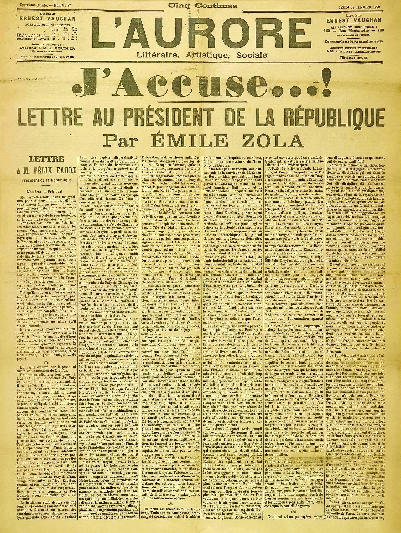오늘날에야 사건의 진실이 명백히 밝혀졌지만, 당시에는 대다수 언론의 자극적인 보도와 반유대주의 분위기가 맞물려 드레퓌스가 유죄라는 주장에 동의하는 사람들도 많았다고 합니다. 그럼에도 불구하고 대표작 <목로주점> 등으로 이미 이름을 널리 알린 소설가였던 에밀 졸라는, 일면식도 없는 드레퓌스를 위해 로로르 신문에 "나는 고발한다"라는 글을 기고합니다.