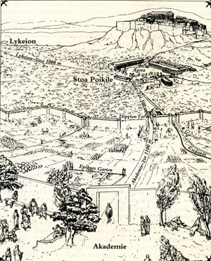 에피쿠로스는 정치적인 추방을 당하여 망명생활을 하다가 그의 제자들이 아테네에 집과 정원을 마련해 주어서, 이후로 아테네에 정착하였다. 그는 아테네에 정원(garden)이라는 학교를 세웠다. 이것이 아테네의 네 학원 중 세 번째 것이다(참고로 첫째는 플라톤의 아카데메이아, 둘째는 아리스토텔레스의 리케이온이다). 에피쿠로스는 자신의 망명생활로부터 얻은 경험 때문이었는지, 세상은 오로지 적의에 가득 차 있다고 생각했다. 그래서 인간이 추구하는 선(善)과는 아무런 관계도 없는 이 세상과 벽을 쌓아야 한다고 생각했다. 그리고 그 벽에 해당하는 것이 자신이 세운 학교인 정원이었다.