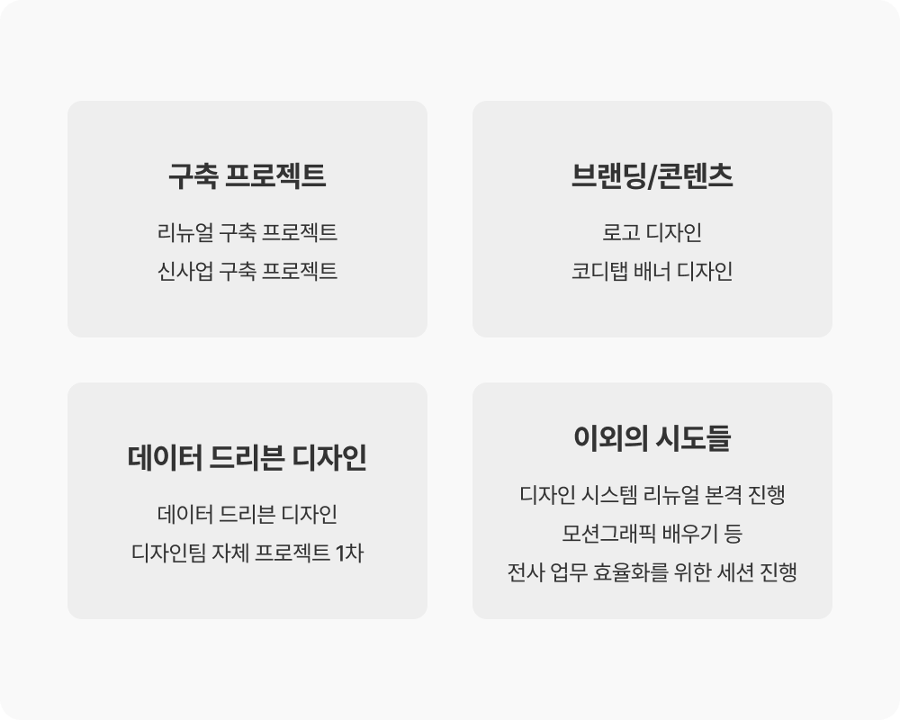 저는 올해 2번의 구축 프로젝트에 메인 디자이너로 참여했어요. 기존의 페이지를 아주 새롭게 리뉴얼하는 프로젝트도 있었고, 회사의 방향성을 담아 신사업 프로젝트에 메인 디자이너로 들어가기도 했어요.
