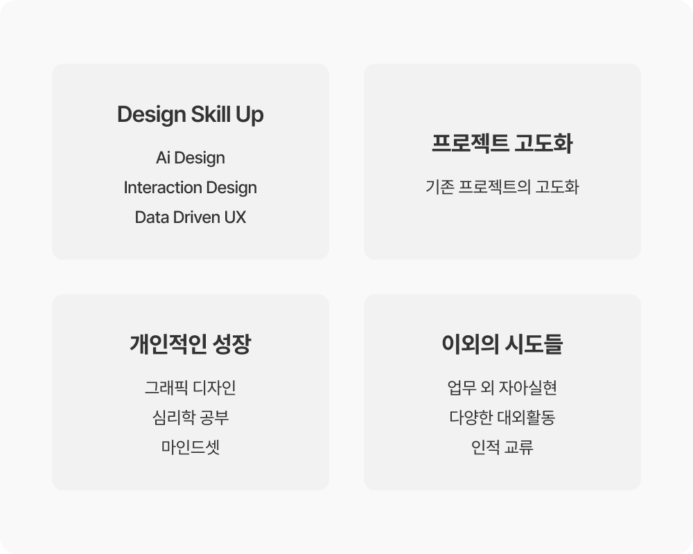 시야가 넓어지려면 아무래도 다른 기업의 프로덕트 디자이너들이 어떻게 일하는지, 그곳의 개발, 기획, 마케팅은 어떻게 진행되는지 이야기도 들어보고 좋은 부분은 타산지석으로 삼고 실패한 경험들은 반면교사로 삼아 더욱 시너지를 냈을 수도 있었을 텐데 올해는 경기도 워낙 안 좋고 회사 내에서 고민들을 많이 하다 보니 외부 활동을 해야지! 해놓고 전혀 하지 못한 부분이 아쉽네요.