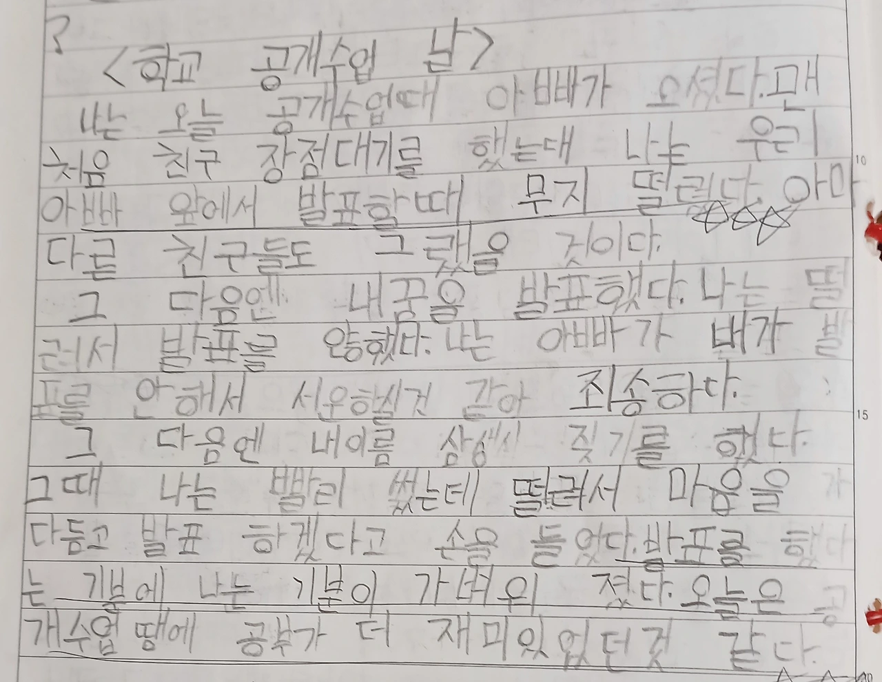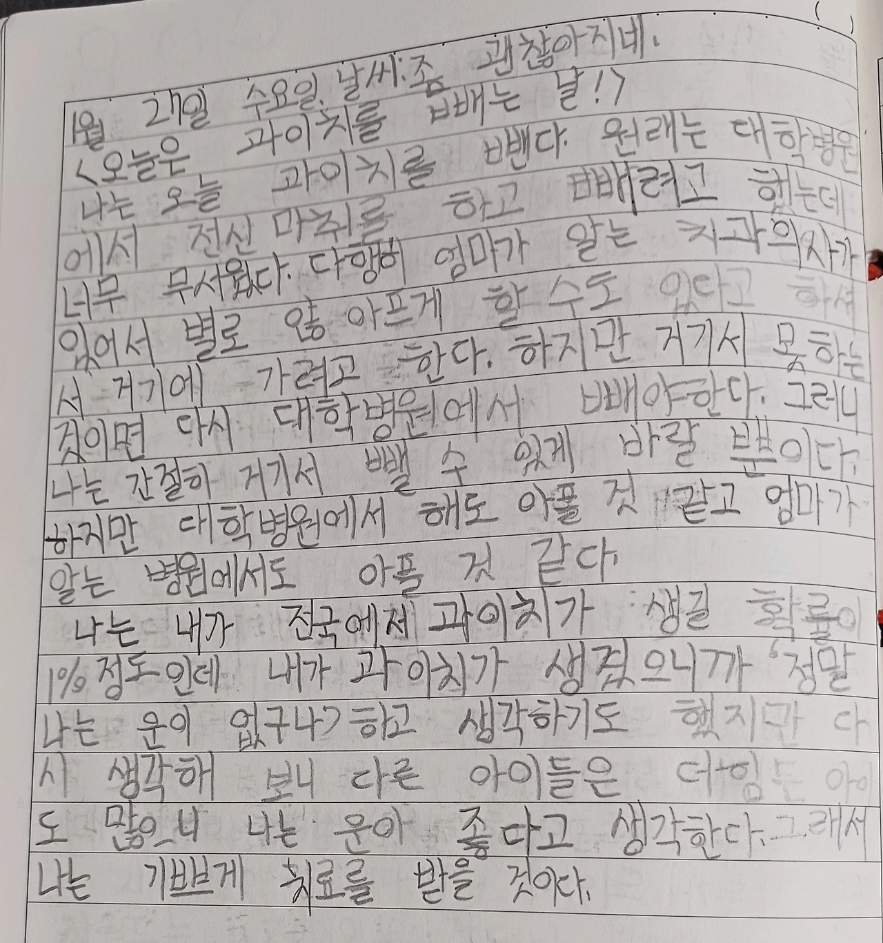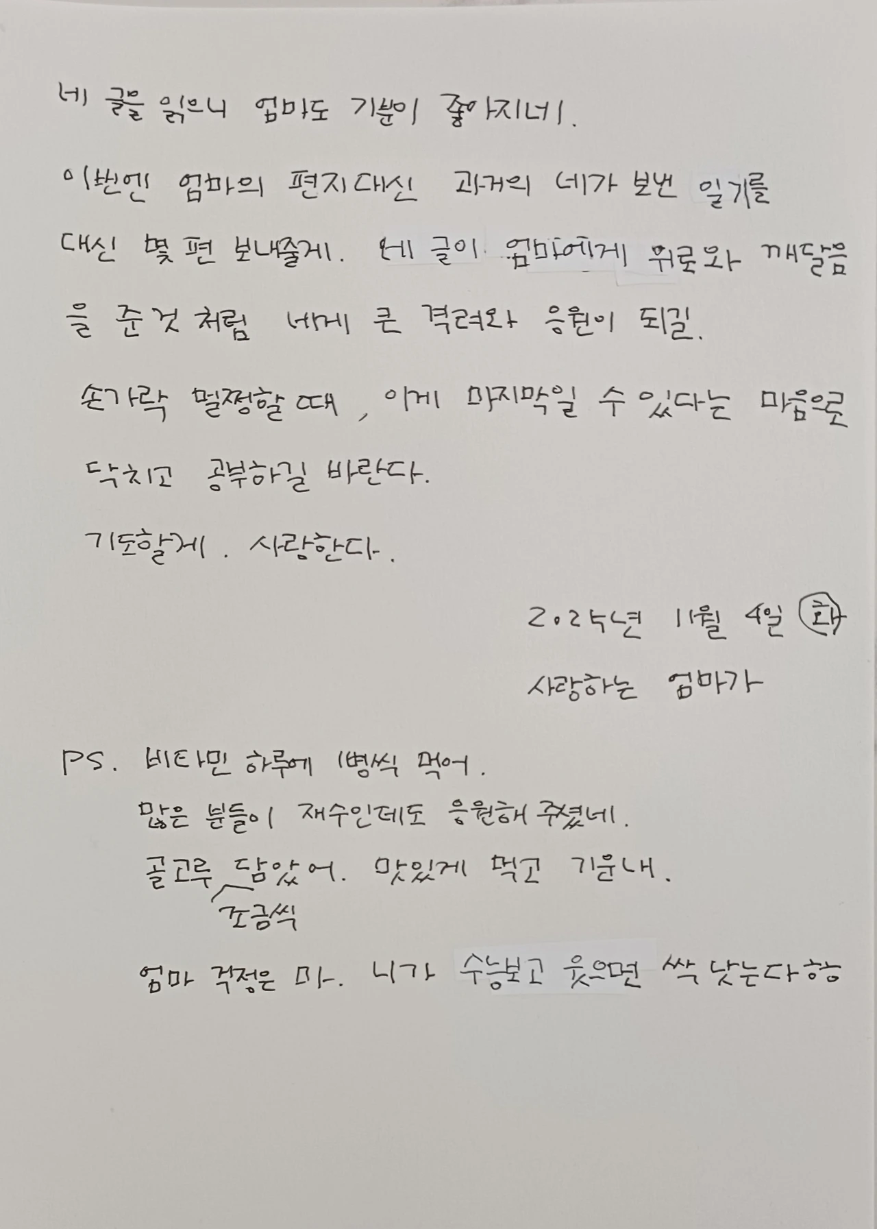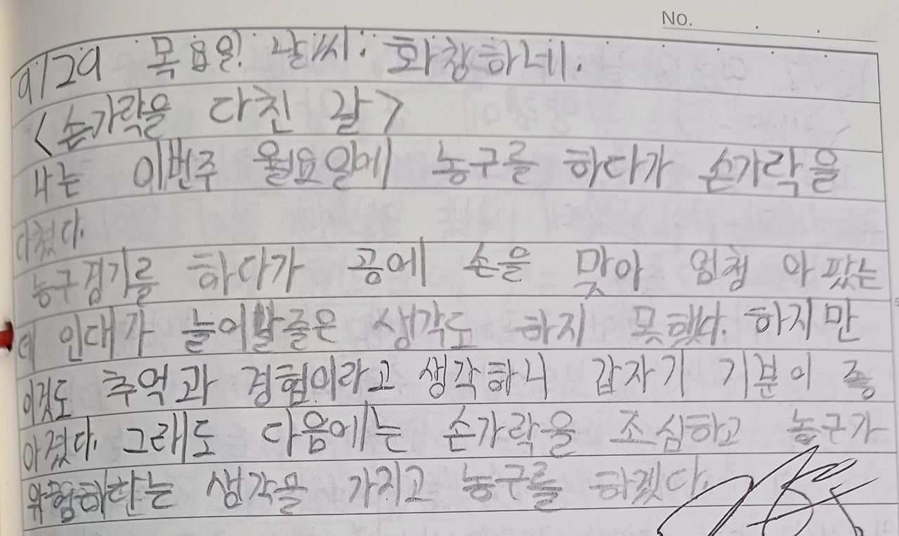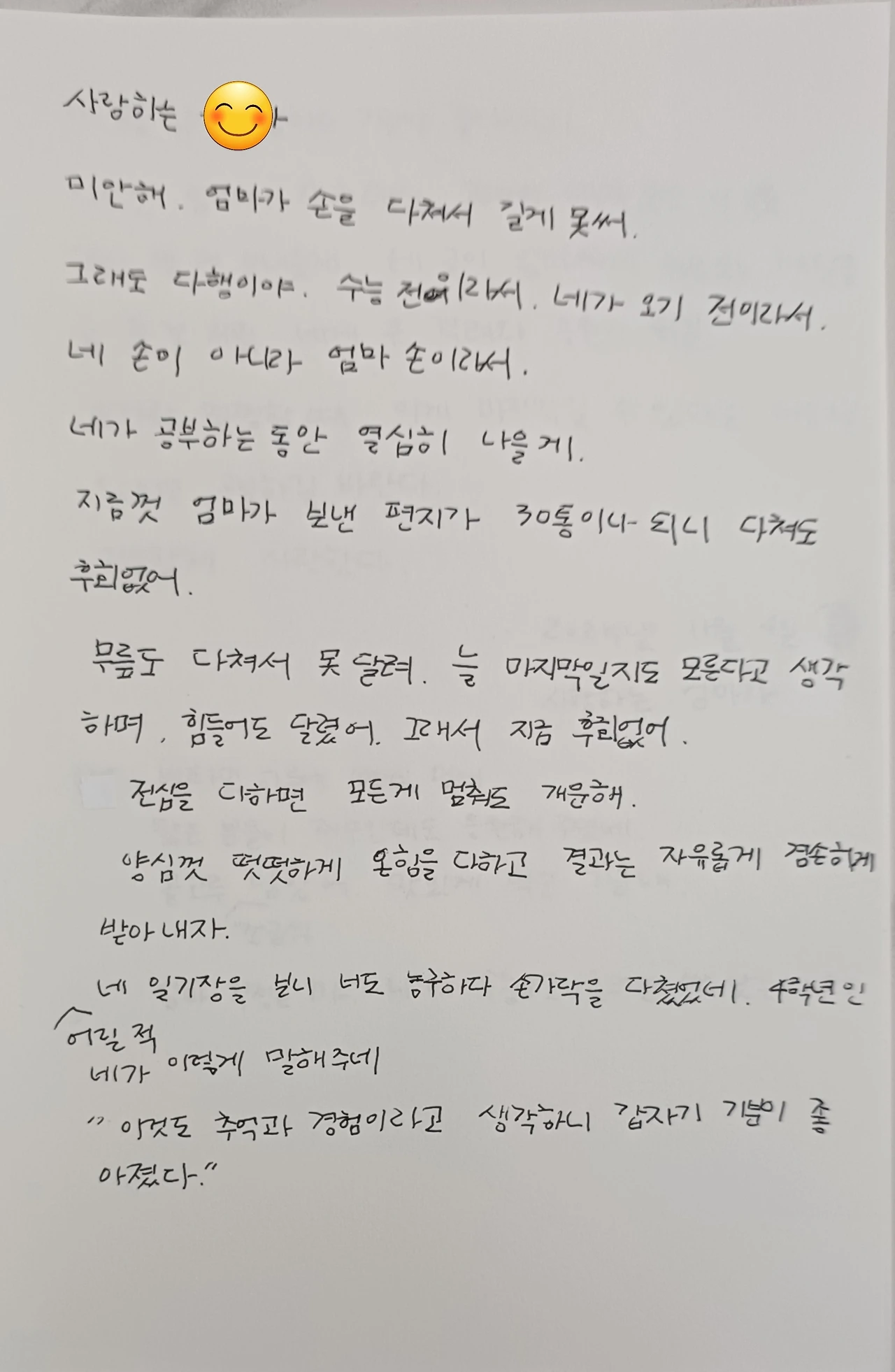 손 어떻게 된 거야. 글씨체가 평소 엄마랑 다른데... 구체적으로 말해줘 어쩌다 다친 건지 어떻게 다친 건지