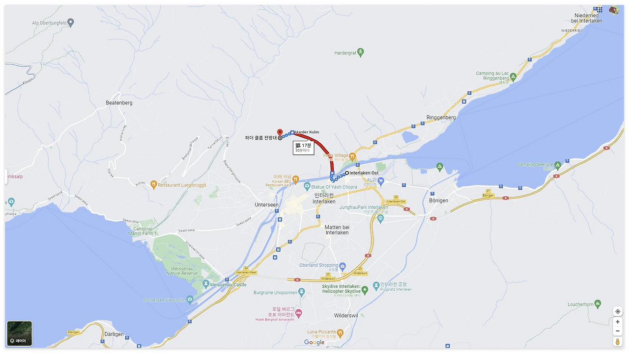 하더 쿨름에서도 여러 가지 하이킹 코스가 있다. 1시간 35분 걸으면 인터라켄 오스트(동역)에도 도착할 수 있단다. 그러나, 그 길을 걸을 마음은 없다. 부실한 무릎은 아직 아껴야 한다,