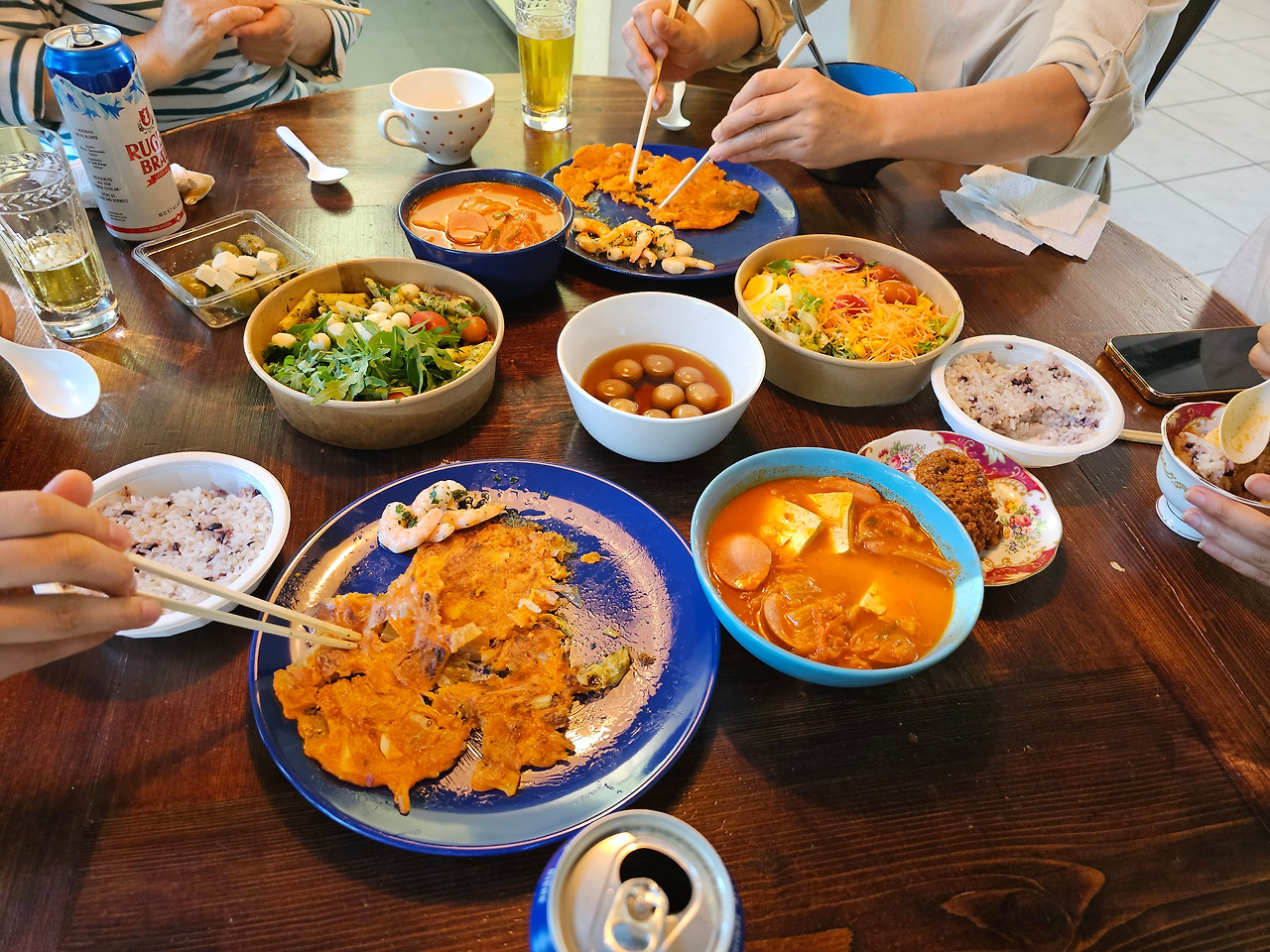 오늘 저녁 메뉴는 김치전과 샐러드. 그리고, 맥주!