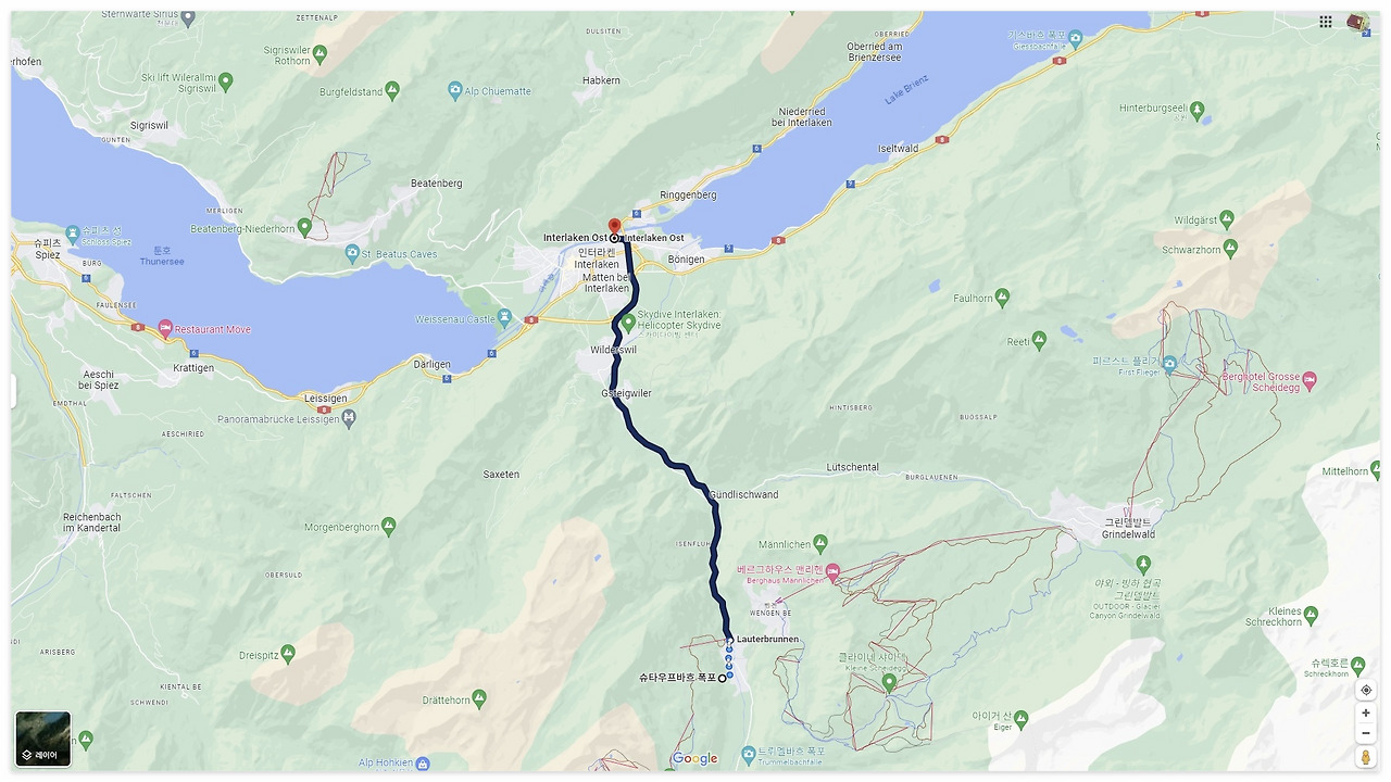 Google Map: 라우터브루넨 發 인터라켄 오스트(동역) 着
