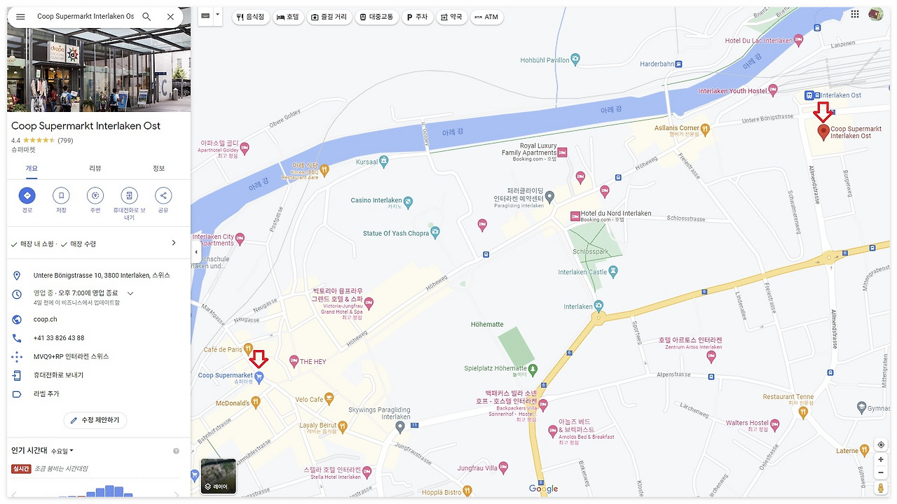 인터라켄 오스트(동역) 앞에 주차를 했으니, 이번에는 장을 보는 것도 역 앞에 있는 COOP 매장으로 간다. 어제 갔던 맥도널드 맞은편 COOP 매장은 큼직한 편의점 크기였다. 역전 COOP은 제대로 대형 매장이었다. 숙소에 남은 먹거리가 많은 덕에 큰 매장에서 간단하게 장을 본다.