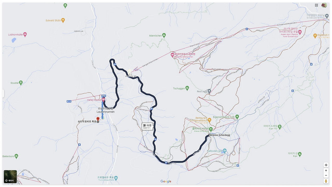 Google Map: 클라이네 샤이덱 發 라우터브루넨 着
