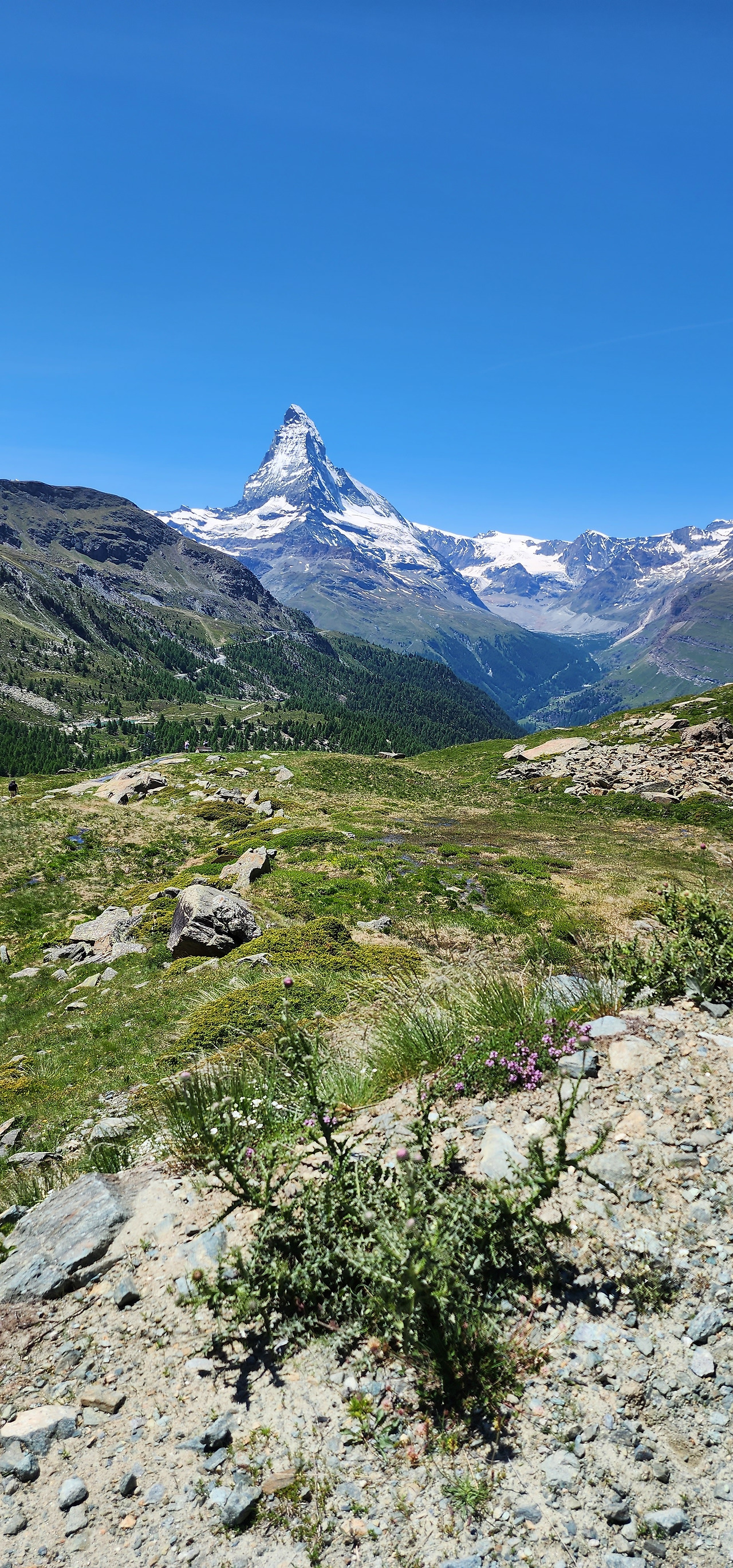 길에서 엉겅퀴 닮은 풀을 보고서, 배경으로 마터호른을 넣어 본다. 풀 한 포기도 예사롭지 않다.