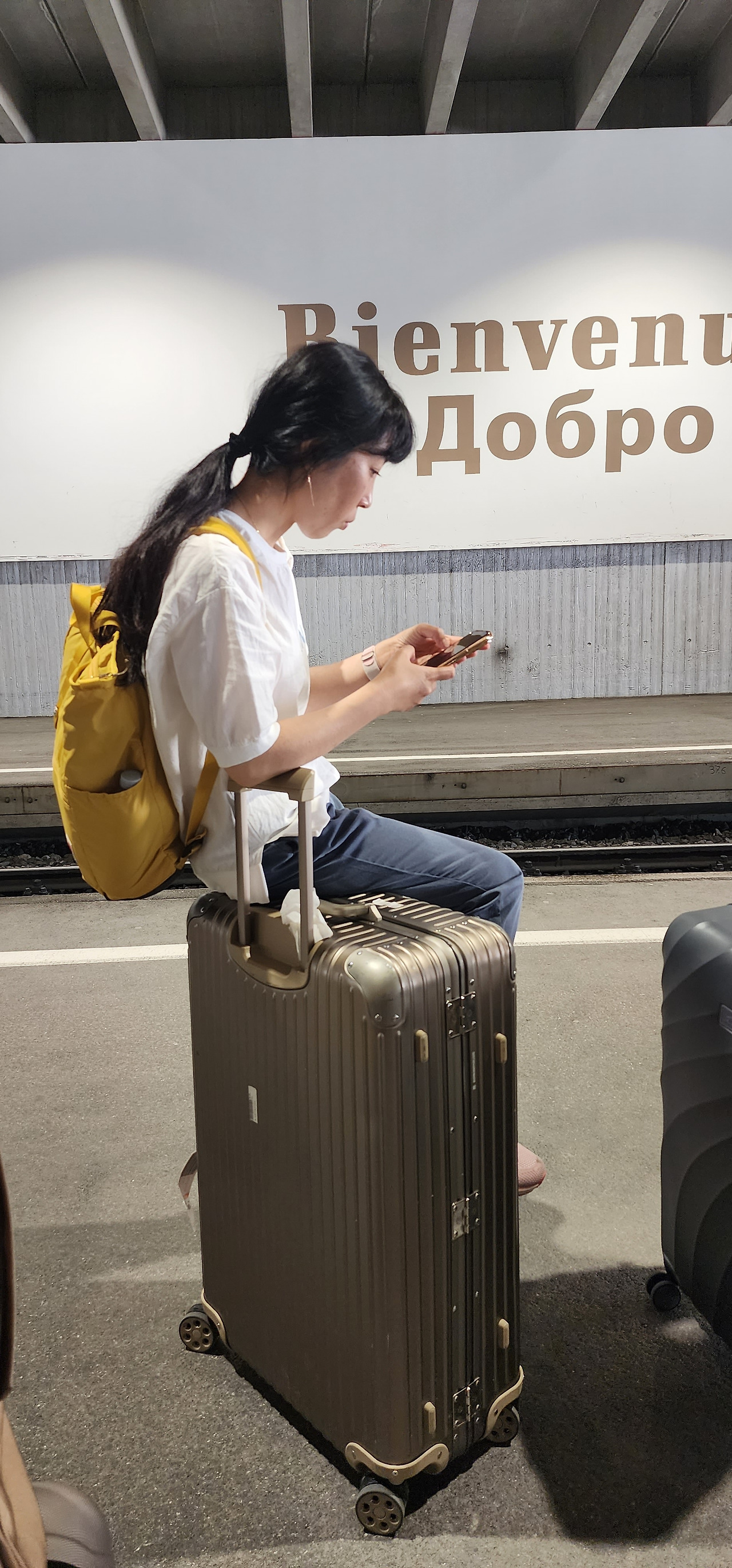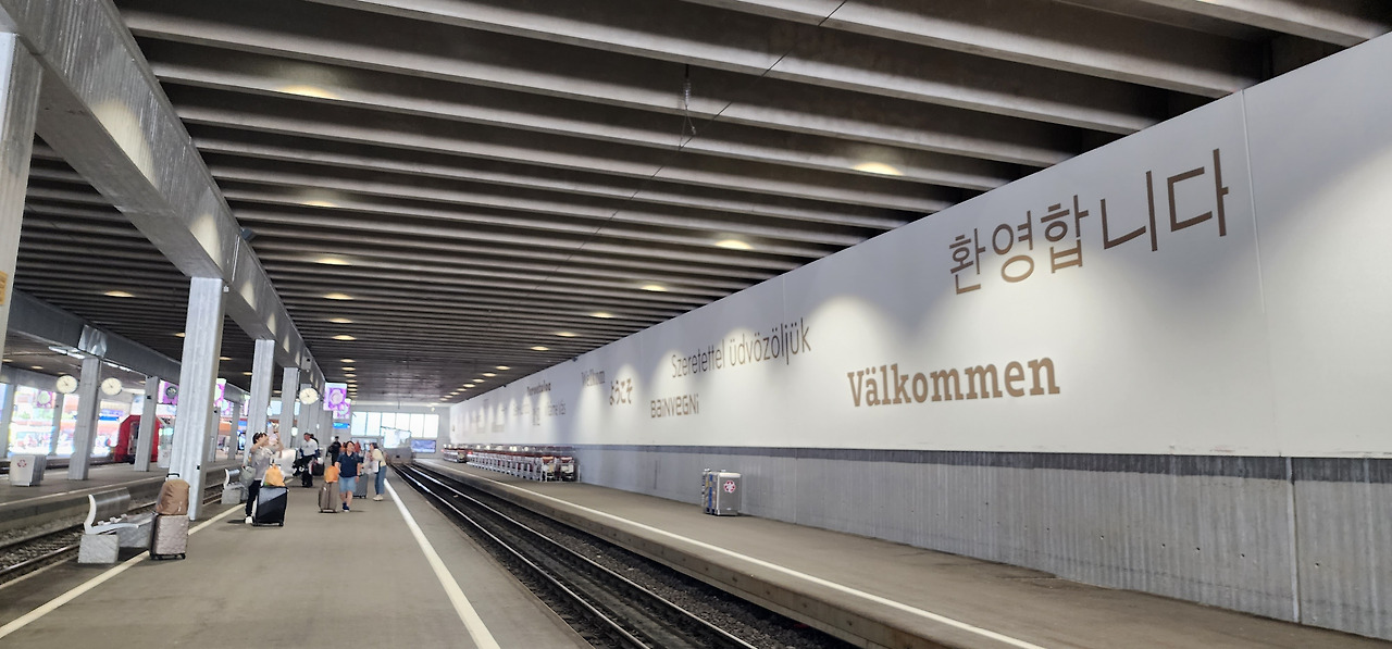 다시 모여 체르마트 역에서 타쉬 행 기차를 기다린다. 이번에는 단체 관광객들이 보이지 않아, 차분한 느낌이다. 15년 전에는 없었던 '환영합니다'라는 인사말. 한국 사람들이 체르마트에 많이 오나 보다.