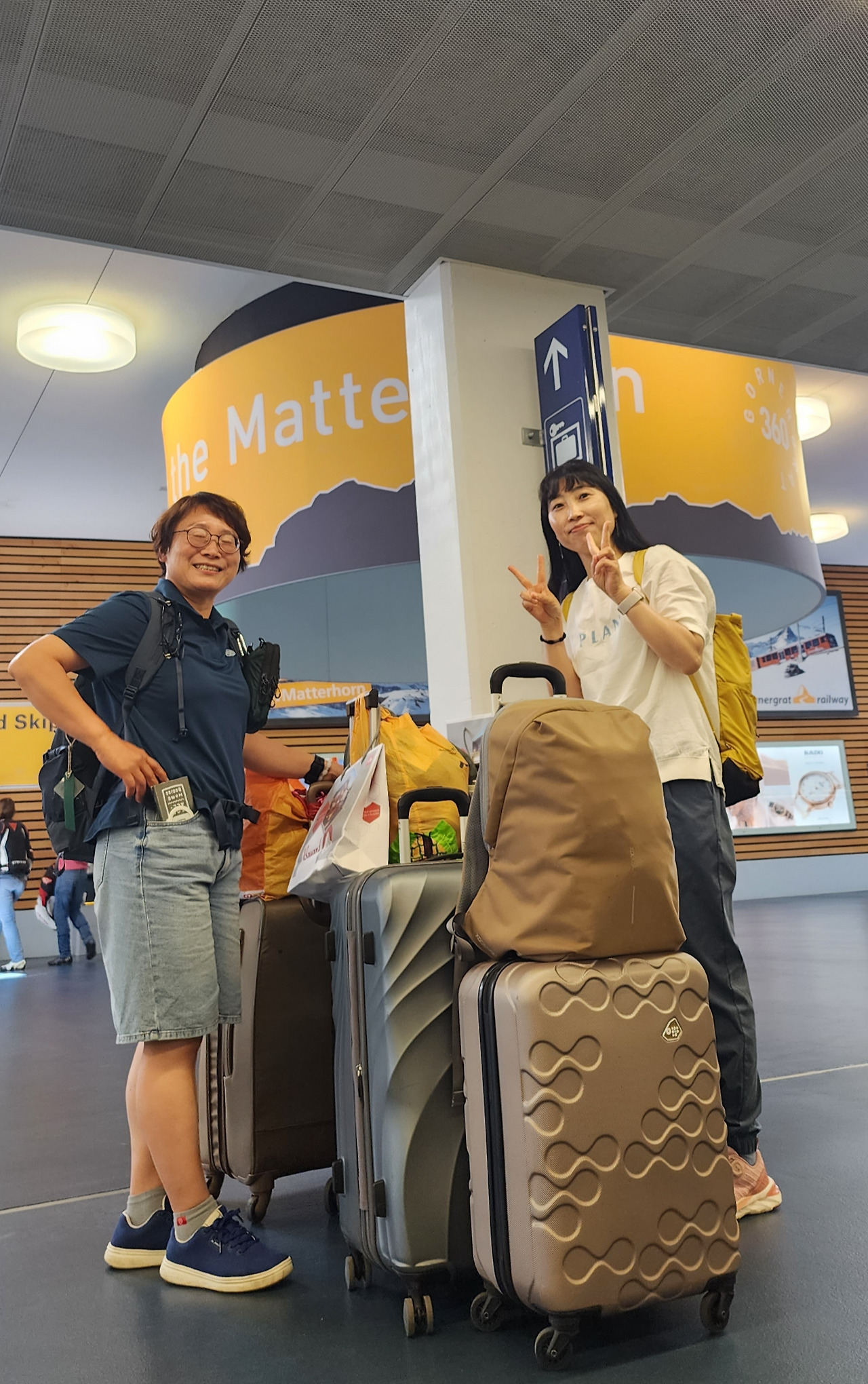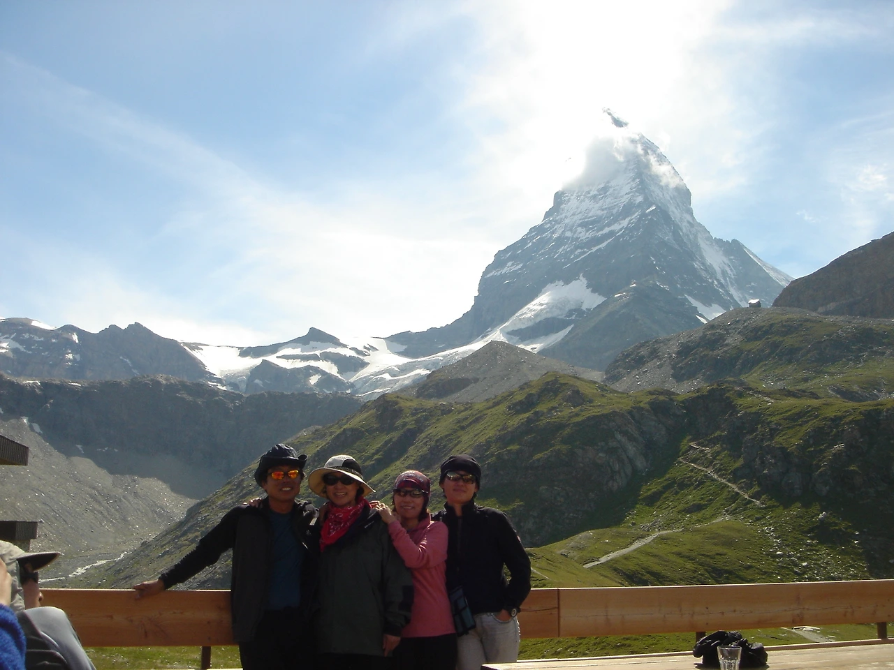 오늘은 일단 회른리 산장까지 올라가실 참이란다. 여기가 어디? 체르마트. 인증 샷을 찍을 때 마터호른을 빼면 이 우연한 만남을 아무도 믿어 주지 않을 터! 마터호른이 보이는 각도에서 자리를 잡고 지나가던 사람을 붙잡고 사진을 부탁한다.