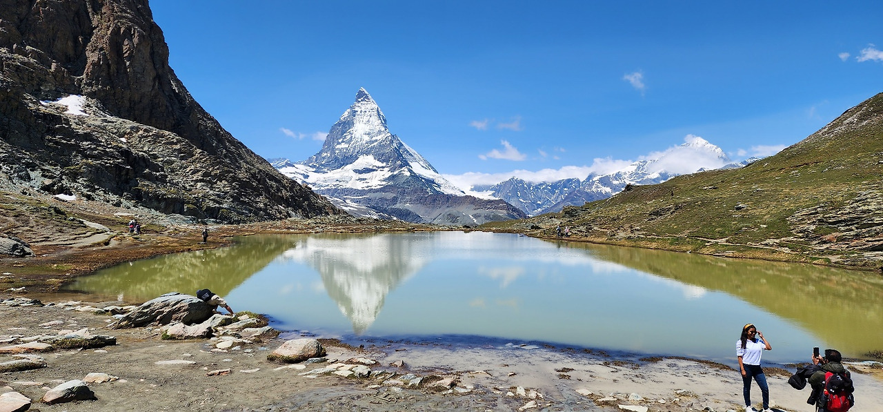 뷰 포인트로 소문이 난 덕분인지 옛날에는 없던 벤치도 놓여 있다. 폰을 꺼내 들고 마터호른을 찍느라 여념이 없다.