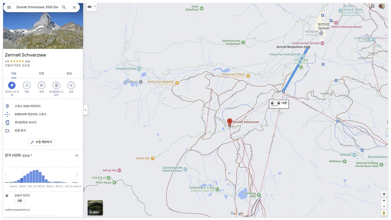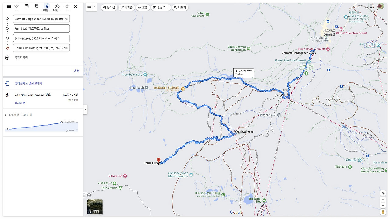 Google Map: Zermatt 發 회른리 산장 着