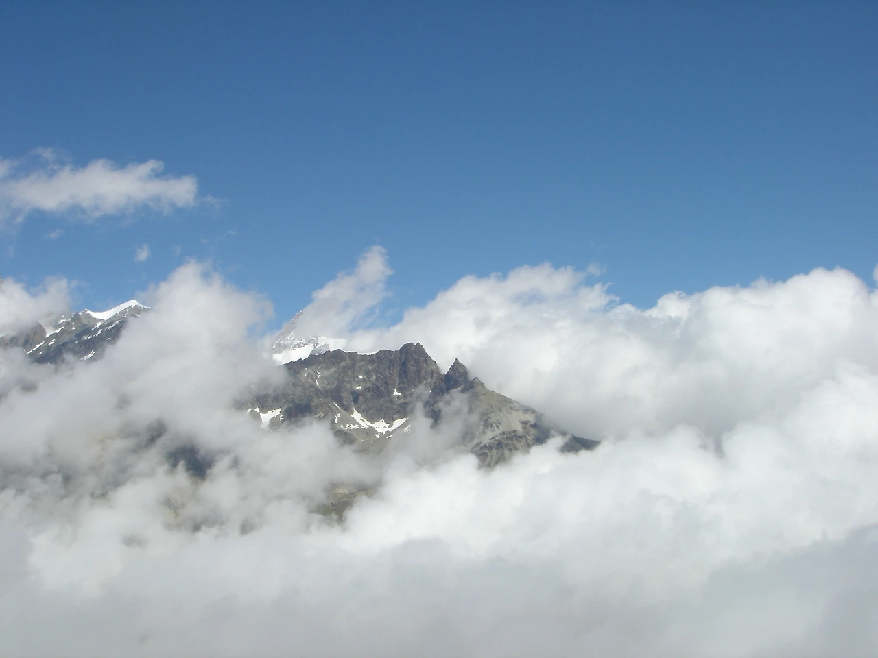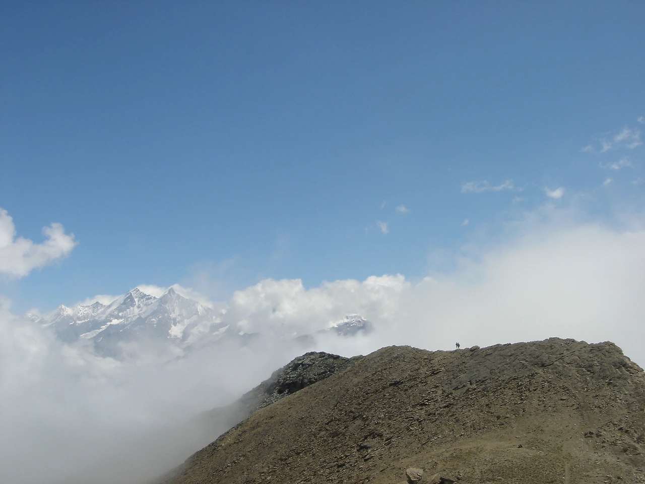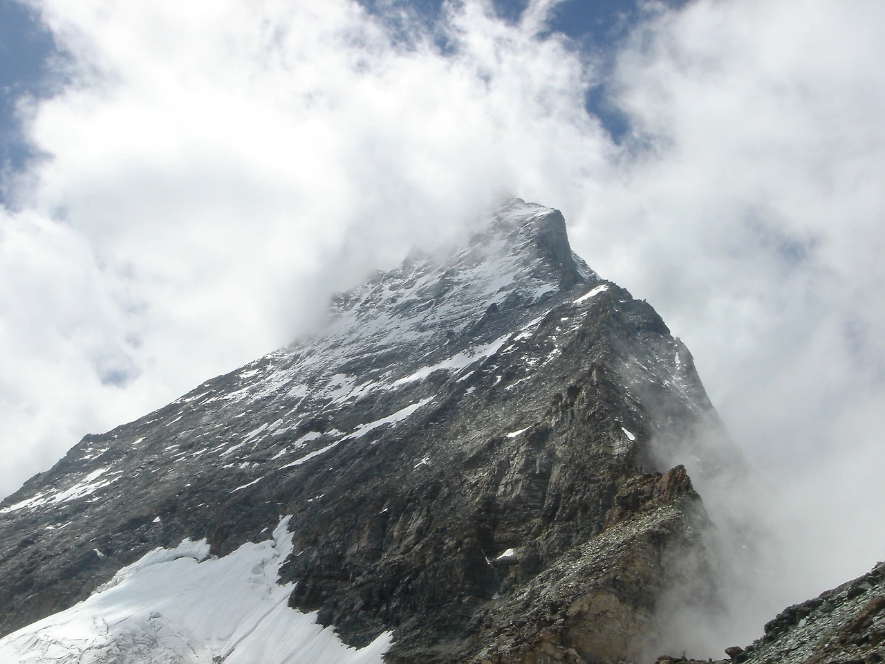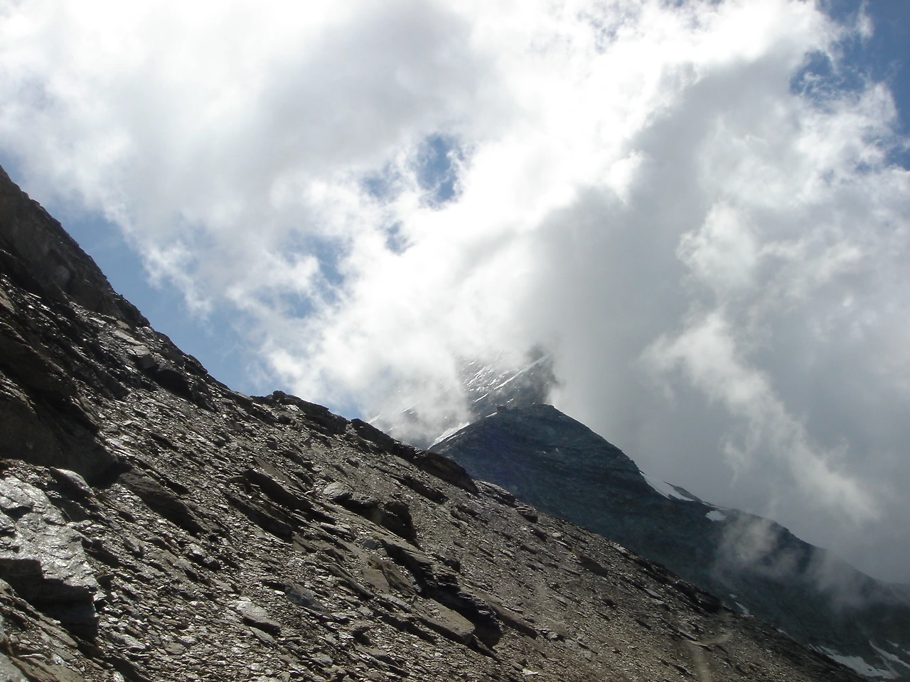 오, 점점 마터호른 정상이 드러난다. 한참 동안 구름이 사라지길 기다려 보지만, 삼각뿔이 아닌 삼각형이 최선이다.