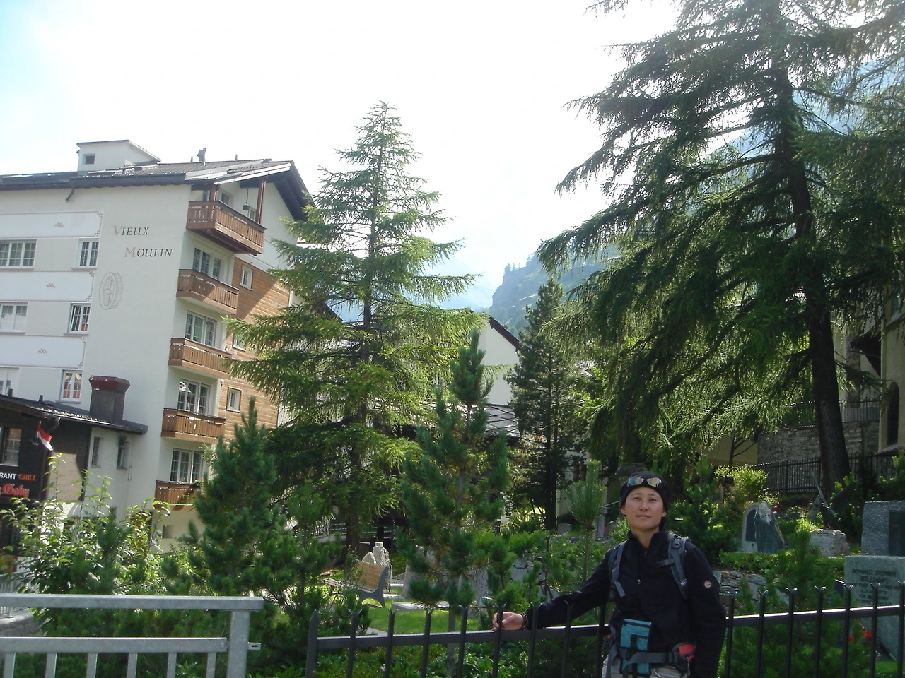 다시 곤돌라를 타고 체르마트로 내려와 산악인의 묘지 앞에서 잠시 쉬어간다. 사진에는 보이지 않지만 나무 사이로 마터호른이 있다.