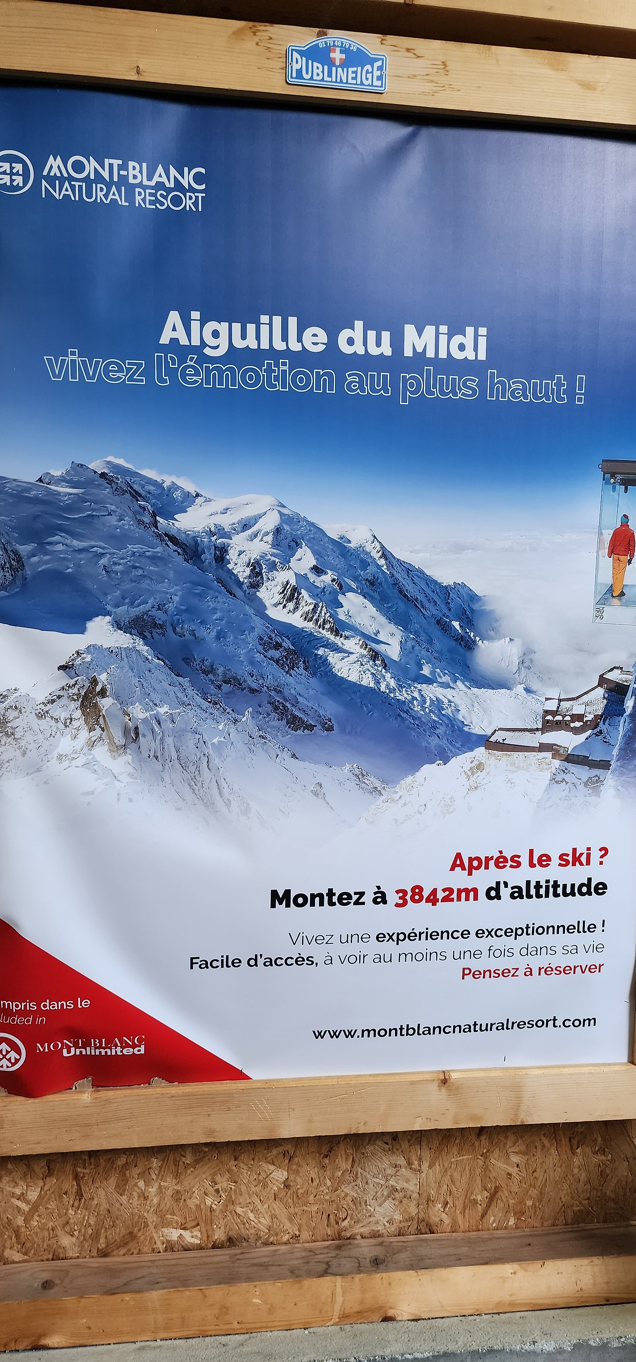 케이블카 승강장에서 다시 만난 에귀 디 미디 광고판에는 우리가 사진에 담은 투명창이 보인다. 몽블랑 정상에 선 느낌을 주고 싶어서 만든 거구나하고 뒤늦게 실감한다.