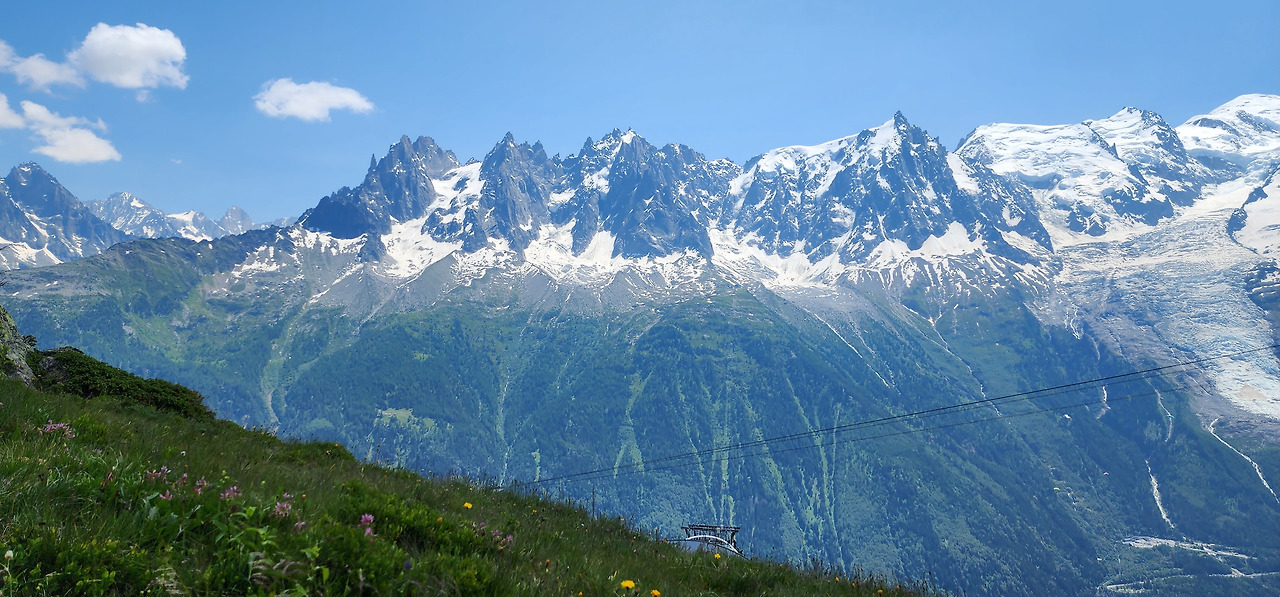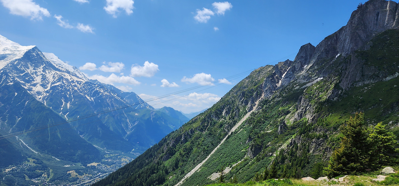 아래를 보면 샤모니, 시선을 가로지르는 선은 바로 케이블카 노선. 오른쪽으로 오르면 브레방(Le Brevent).