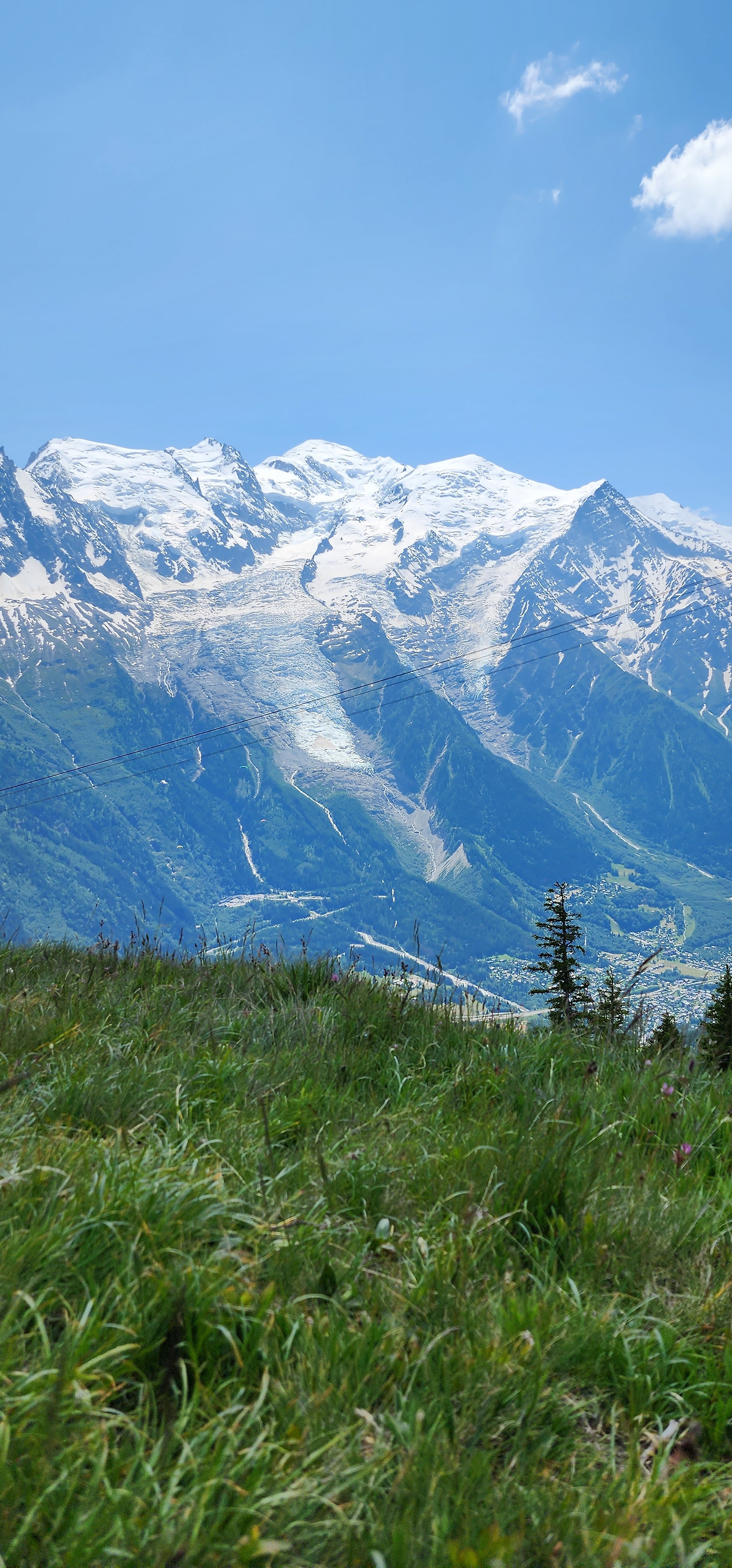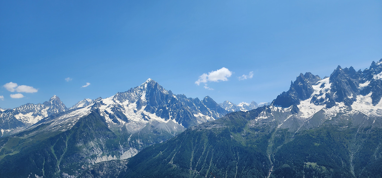 어느새 샤모니 동네를 품고 있는 몽블랑을 넋 놓고 바라만 본다. 세로로 길게 초록 위 몽블랑을 담는다.