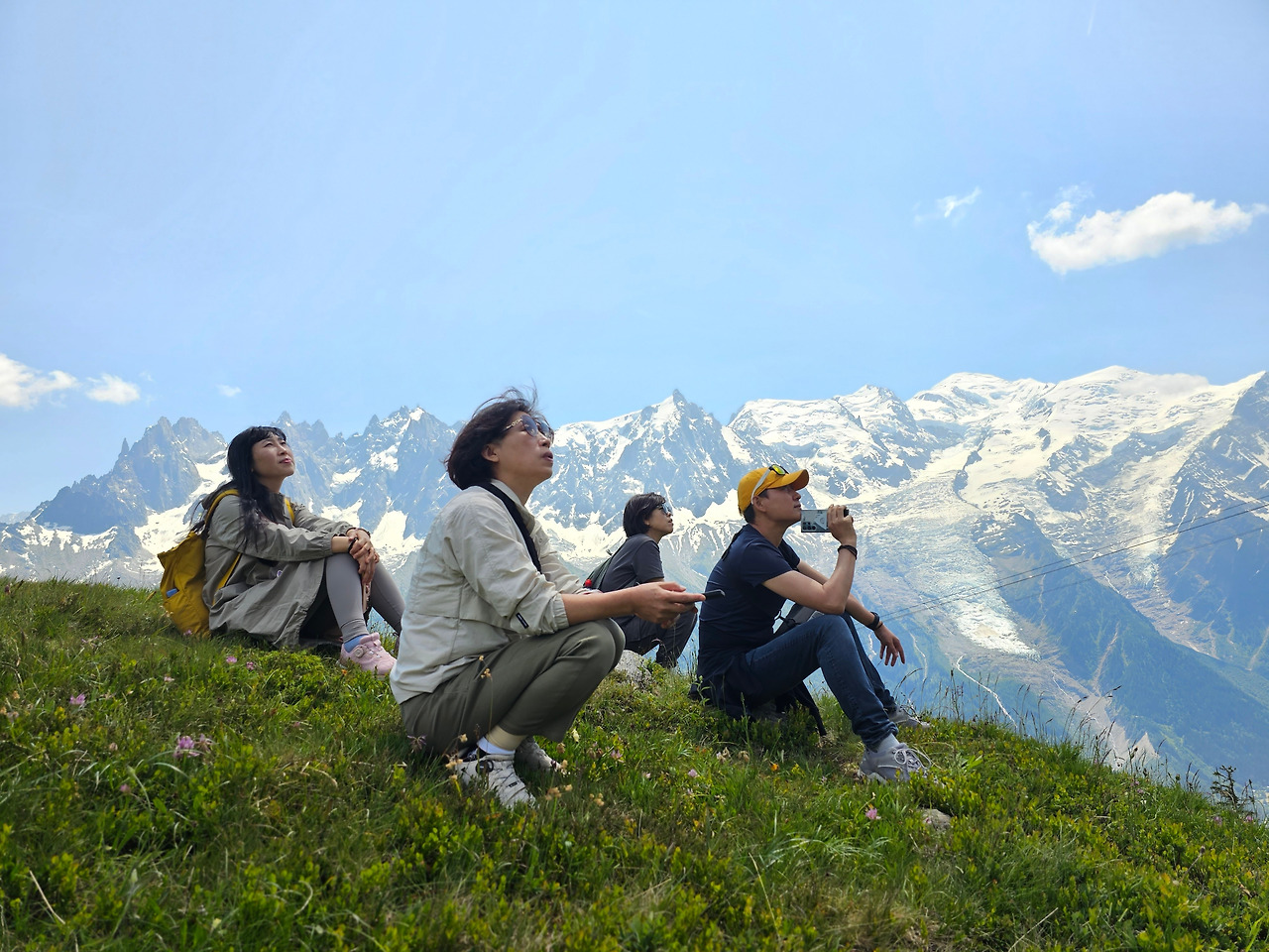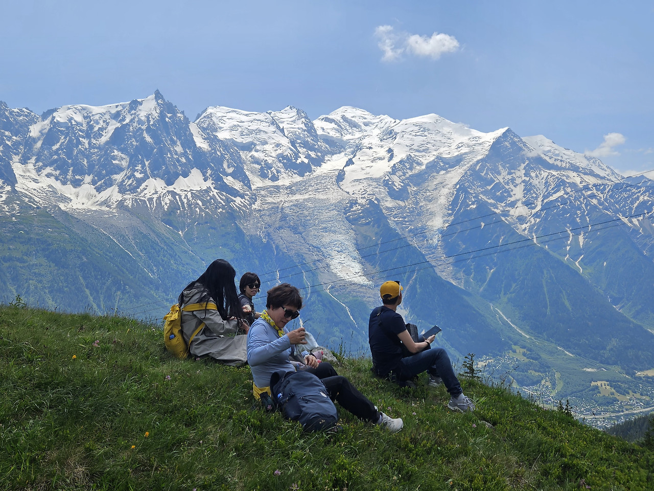 눈앞에 펼쳐진 장관 앞에 더 오르지 않고 쉬어 가기로 한다. 맞은편에는 몽블랑과 그랑드 조랑스 그리고 알프스의 여러 봉우리들.