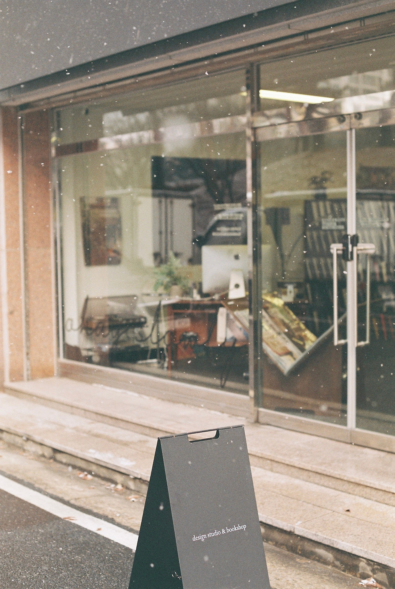 올 1월, 통창에 붙인 레터링 스티커가 눈에 띄도록 마스킹 테이프를 배경처럼 붙여 놓았었는데 돌출간판을 달면서 마스킹 테이프를 떼고 싶어졌다. 금방 할 줄 알았는데 반년 동안 한자리에 붙어 있었더니 테이프 접착제가 유리창에 눌어붙어 잘 떼어지지 않았다. 하루는 통창, 하루는 유리문을 목표로 마스킹 테이프에 세제를 바른 후 칼등으로 긁어 가며 제거한 지 이틀째. 한참 유리문과 씨름하고 있는데 눈이 내리기 시작했다.
