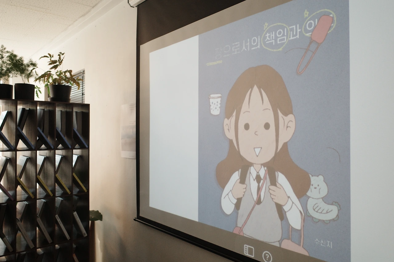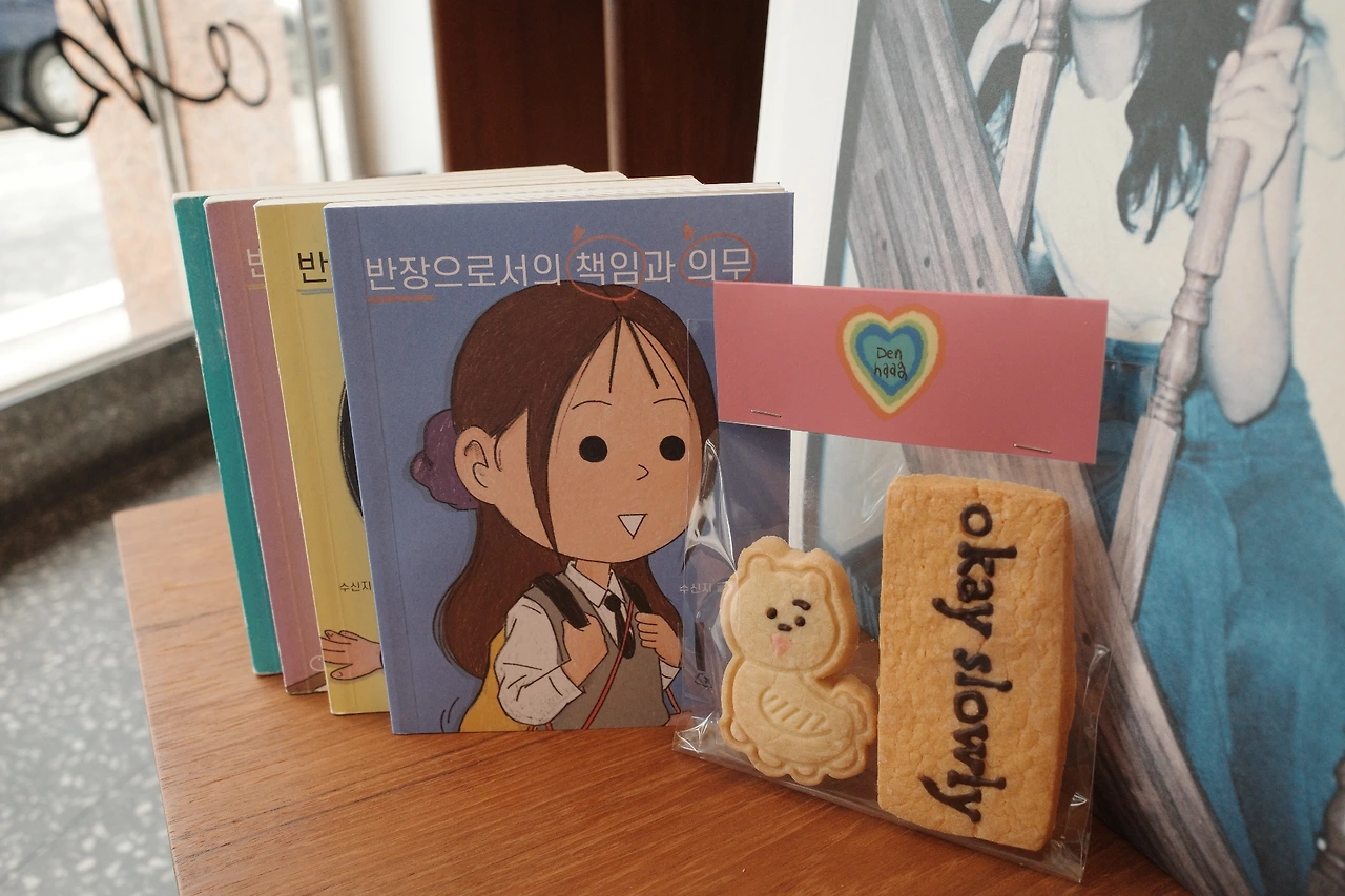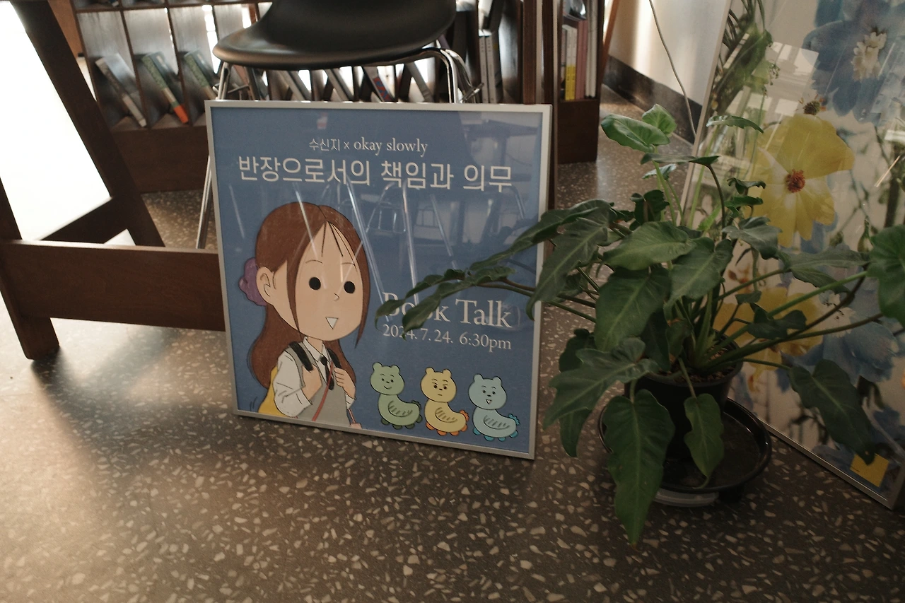 무엇을 바라거나 기대하고 간 도서전이 아니었는데 국제도서전에서 처음 공개하는 『반장으로서의 책임과 의무 4』를 구매하기 위해 수신지 작가님 부스를 찾았던 일이 씨앗이 되어 북토크로 연결되었다. 대전의 한 어린이 도서관에서 어린이와 청소년 대상 북토크를 하게 되었는데, 조금 더 많은 독자를 만나고 싶은 마음에 작가님이 직접 DM으로 연락을 주신 것이다. 후일담을 말하자면 ‘오케이 슬로울리’로 사인을 받으면서 슬로‘우’리가 아닌 ‘울’ 임을 몇 번 반복한 것이 엄청난 각인 효과를 주었다고 하셨다.