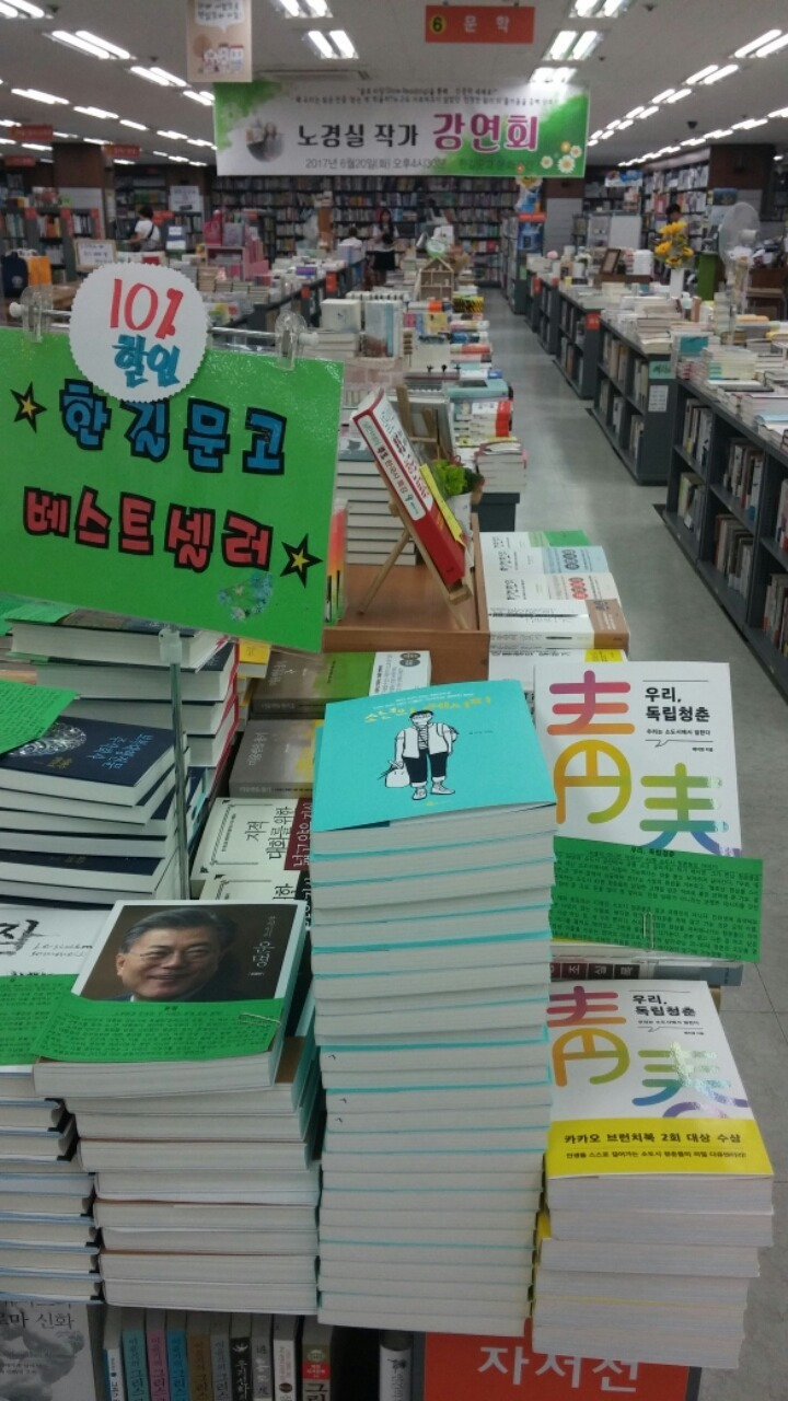 내가 두 번째로 쓴 책 <소년의 레시피>는 2017년 6월에 출간되었다. 한길문고에는 도착하자마자 베스트셀러였다. <문재인의 운명> 특별판과 나란히 누워있는 모습은 너무 근사했다. 그런데 내 입안은 마르고 코끝은 시큰해졌다.