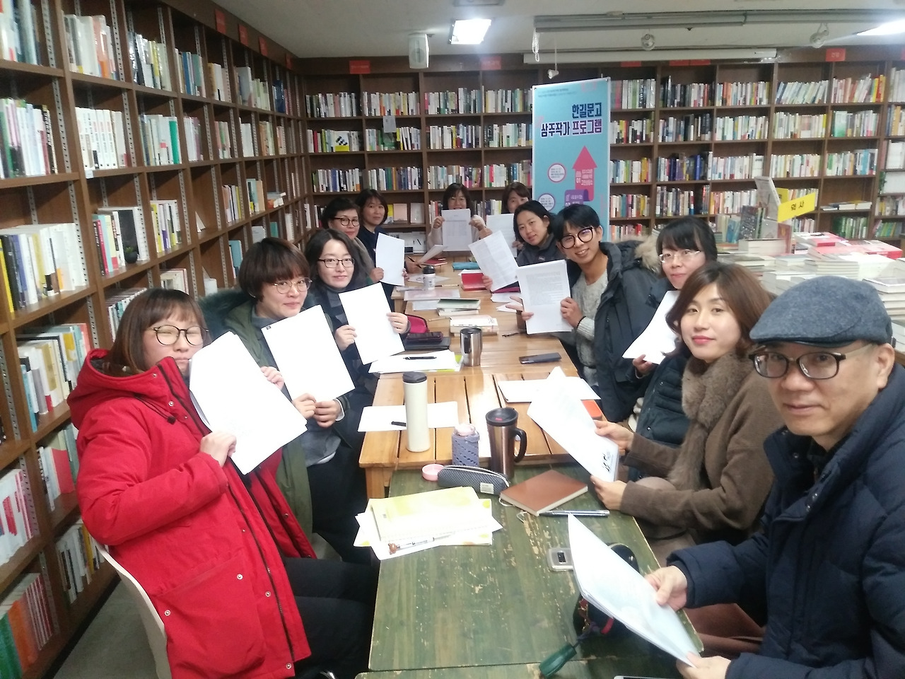 상주작가도 직장인. 연장근무 할 일은 생겼다. 전교생이 열한 명인 군산 내흥초등학교에서 한길문고에 온다고 하니까 쉬는 날(수요일)에 일부러 출근해서 만났다. 크리스마스라서 할 수 없었던 에세이 쓰기 수업도 휴일에 나가서 했다. 그러니 은산씨와 광웅씨를 따로 만날 때도 퇴근했다가 밤에 다시 서점으로 출근했다.