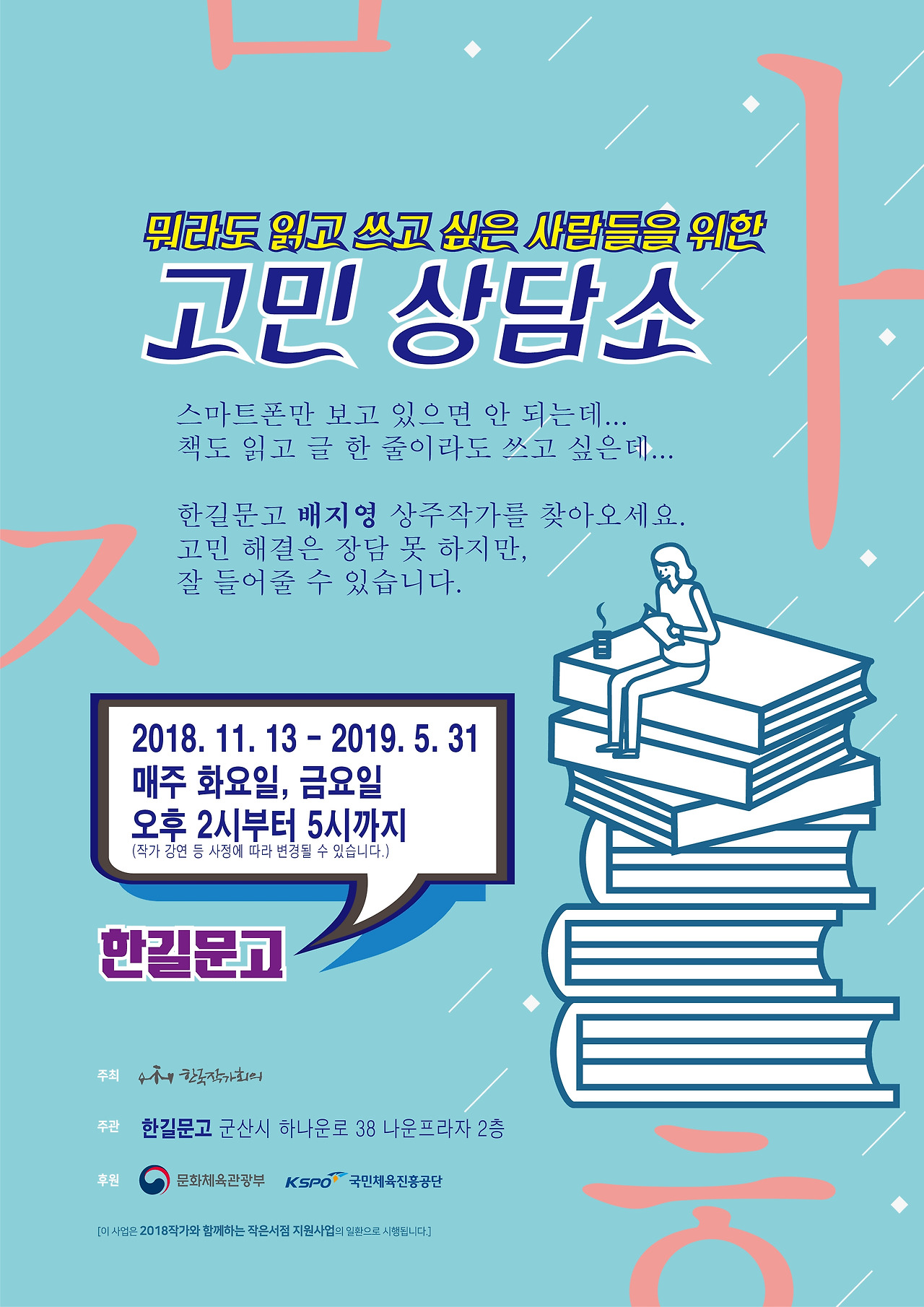 2018년 10월부터 군산 한길문고 상주작가 (문화체육관광부가 주최하고 한국작가회의가 운영하는 ‘2018년 작가와 함께하는 작은서점 지원사업’)가 되었습니다. 문학 코디네이터로 작은서점의 문학 프로그램을 기획하고, 작가와 독자가 만나는 자리를 만듭니다. 이 연재는 그 기록입니다.