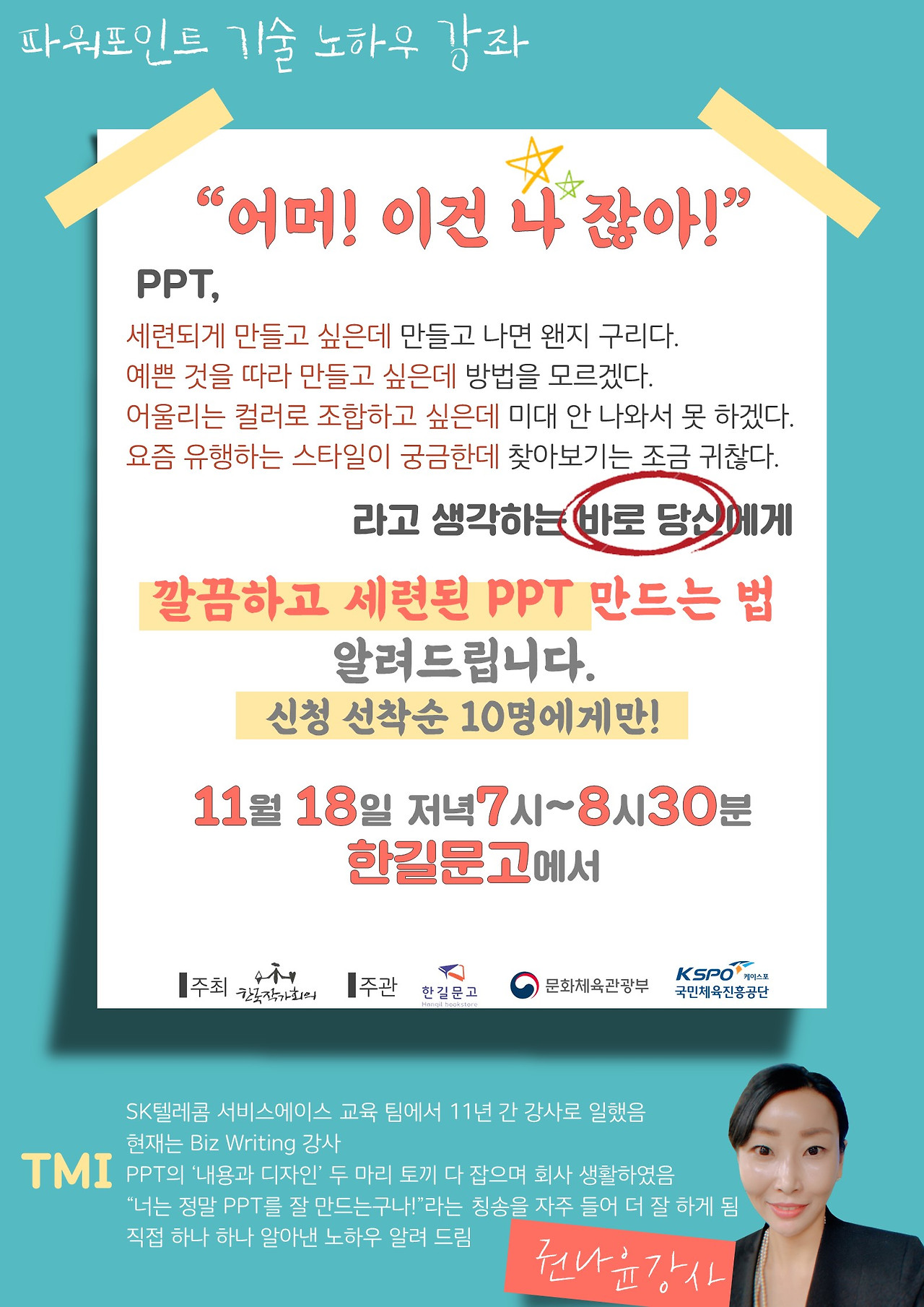 저마다 나윤씨를 환대했다. 나윤씨가 작가 강연을 듣기 위해 의자에 앉아 있거나 매대에서 책을 보고 있어도 따뜻한 시선으로 봤다. 밥은 먹고 다니느냐고, 방은 따뜻하냐고 물었다. 참지 않고 유리병에 김치를 담가다 주고 차 마시러 오라고 초대하는 선생님도 있었다. 나윤씨도 뭔가를 보답하고 싶어 했다. 한길문고에서 ‘깔끔하고 세련된 PPT 만드는 법’강의를 해주었다. 참석한 사람 모두에게 따로 참고자료를 보내줬다.