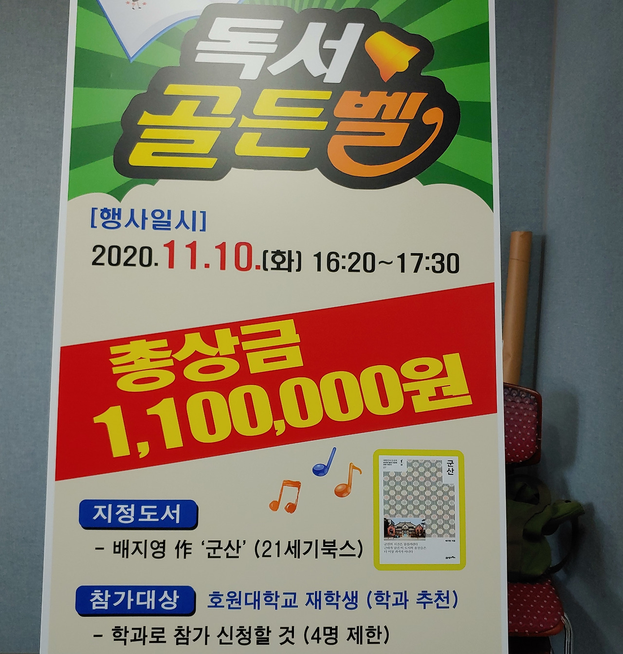 오후에 호원대학교 도서관에서 대한민국 도슨트 <군산>으로 독서골든벨을 했다. 코로나 이전에는 300명이 모여서 하던 행사였는데 비대면으로 했다. 학생들은 성적에 따라서 상금과 포인트를 받는다.