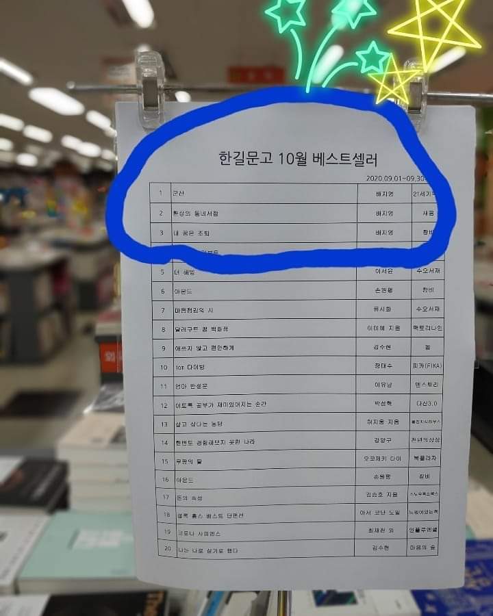 올해 6월부터 <내 꿈은 조퇴>, 대한민국 도슨트 <군산>, <환상의 동네서점>, <소년의 레시피>가 번갈아 가면서 한길문고 베셀 1위를 했다. 10월에는 내 책이 한길문고 베셀 1위, 2위, 3위를 했더랬다.