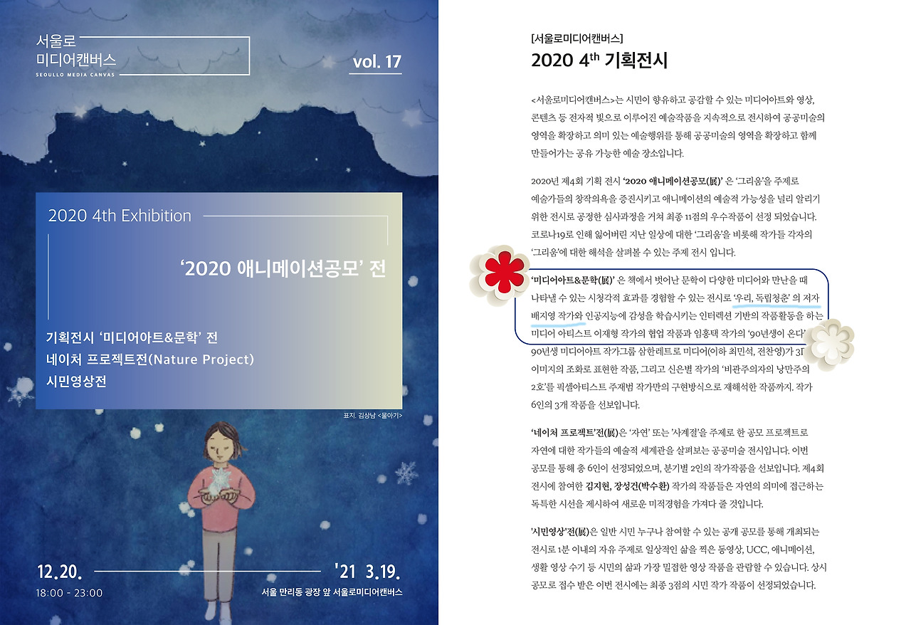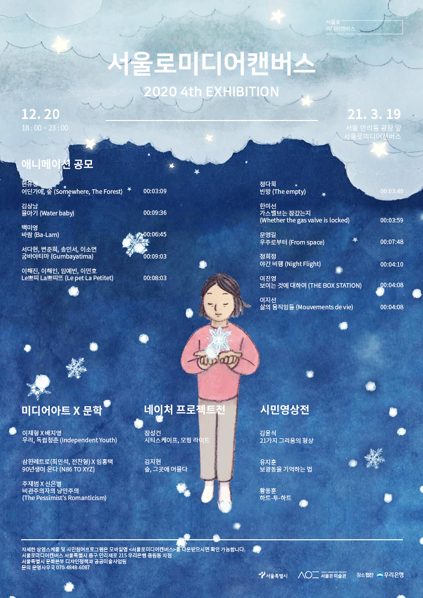 올해 서울로미디어캔버스 네 번째 전시회는 12월 20일부터 2021년 3월 19까지 석 달간 한다. 애니메이션 공모, 미디어아트☓문학, 네이처 프로젝트전, 시민영상전으로 나뉜다.