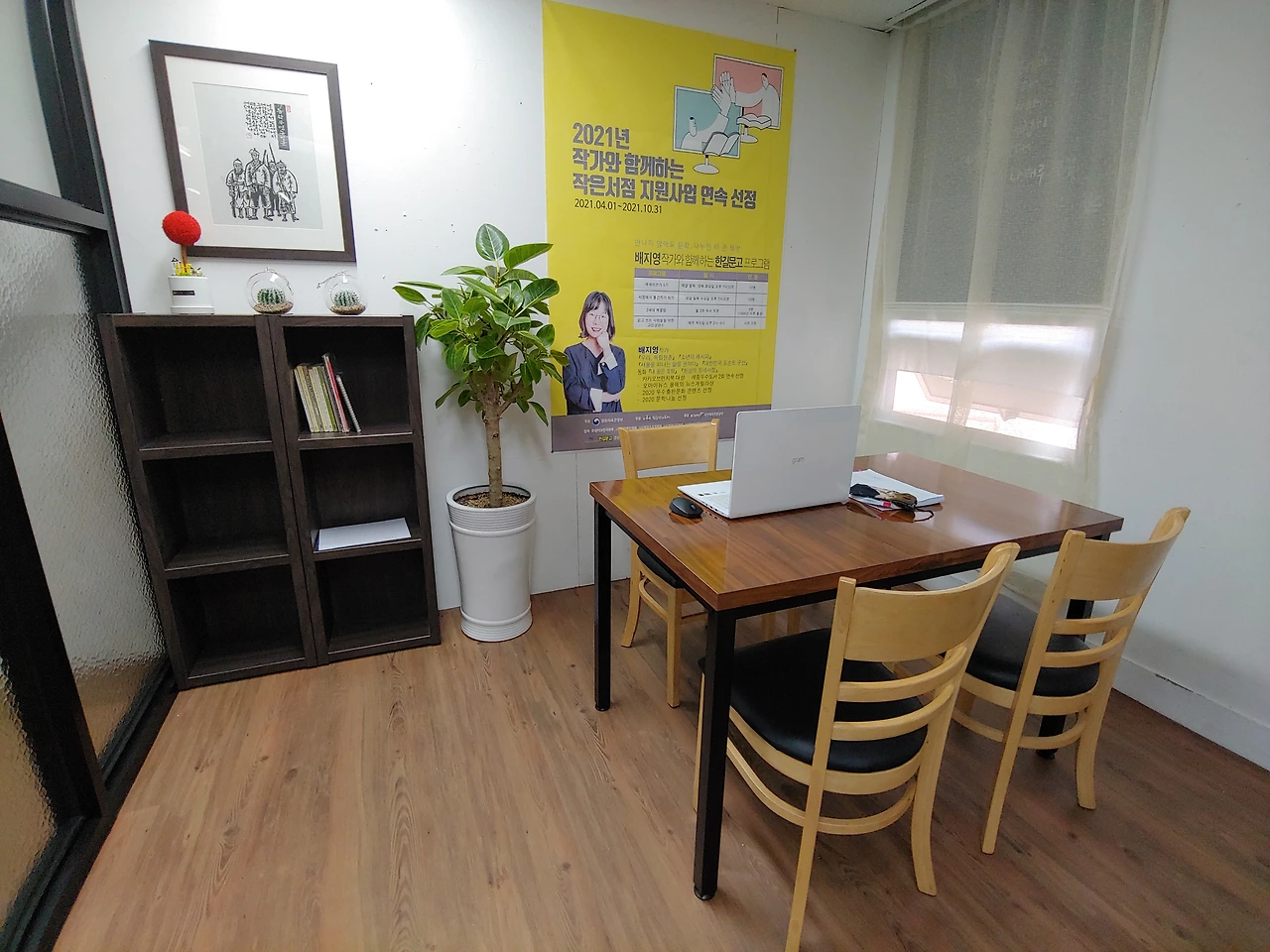 서점에서 방을 만들어줬어요. 창문을 열면 중정 같은 공간이 보여요. 거기에는 에어컨 실외기 여덟 대와 수수꽃다리 나무가 있거든요. 그래서 점장님한테 실외기 싹 치우고 수수꽃다리 옆에 잘생긴 소나무 두 그루만 심어달라고 했어요.