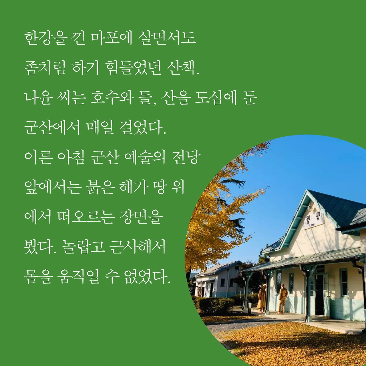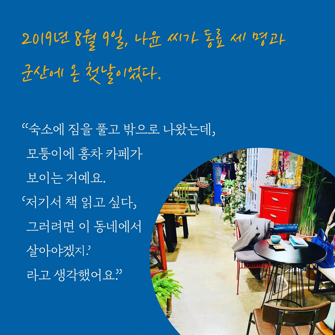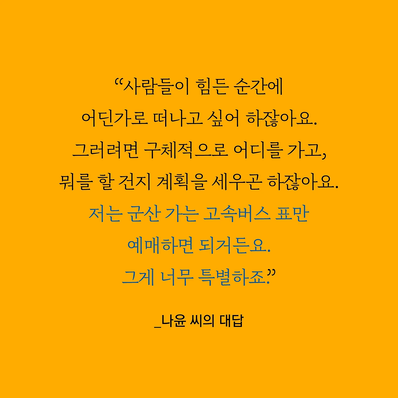 “사람들이 힘든 순간에 어딘가로 떠나고 싶어 하잖아요. 그러려면 구체적으로 어디를 가고, 뭐를 할 건지 계획을 세우곤 하잖아요. 저는 군산 가는 고속버스표만 예매하면 되거든요. 그게 너무 특별하죠. 누구나 그런 공간에 대한 갈망이 있지만, 막상 그걸 가진 사람은 많지 않으니까요.” - 권나윤씨의 말.