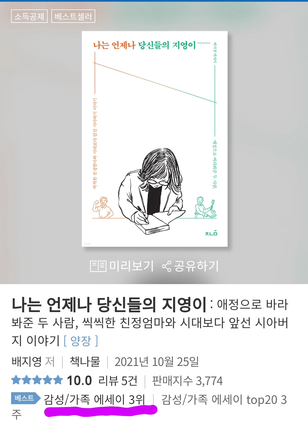 수요일에 <나는 언제나 당신들의 지영이>는 예스24 감성/가족 에세이 분야 3위를 했습니다. 잠깐 미치더라고요. ‘2위나 1위 할 수도 있는 거 아니야?’ 잠깐 아니고 거의 20시간 동안이요.