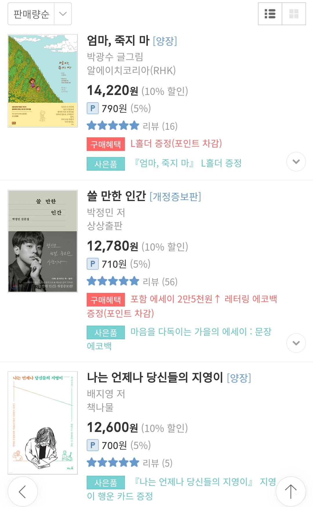 정신을 차리고 살펴 보니 2위는 박정민 배우님의 <쓸 만한 인간>, 저는 이 책을 읽고 한길문고 선생님들에게도 추천했습니다. 1위는 <엄마, 죽지 마>. 알 만한 사람은 다 아는 ‘광수 생각’의 박광수 작가님이셨어요.