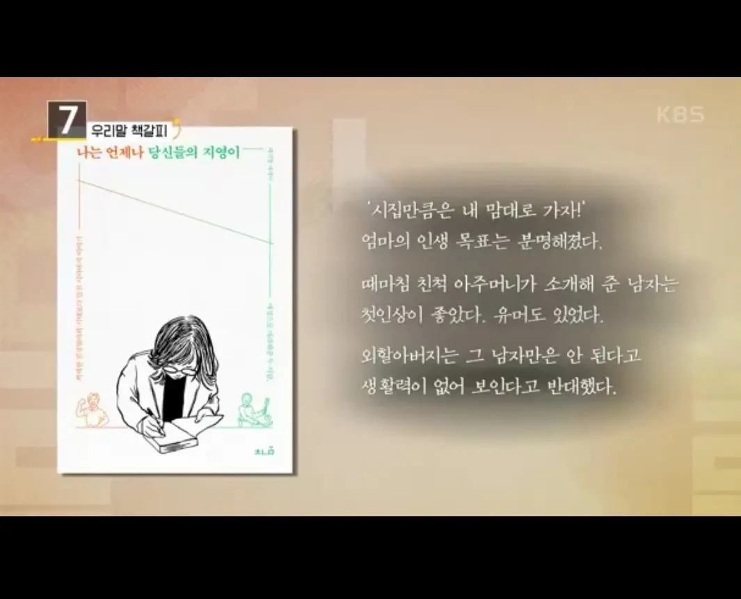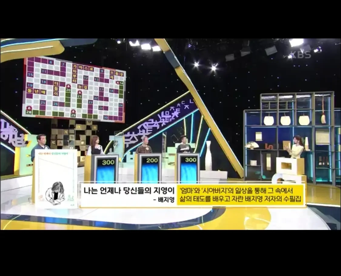 어제 저녁 7시 40분, KBS <우리말 겨루기>에 <나는 언제나 당신들의 지영이>가 출연했어요. 1~2초 나온 게 아니에요. 쫌 길게 나왔어요. 엄마와 시아버지의 일상을 통해 그 속에서 삶의 태도를 배우고 자란 배지영 저자의 수필집이라고요.