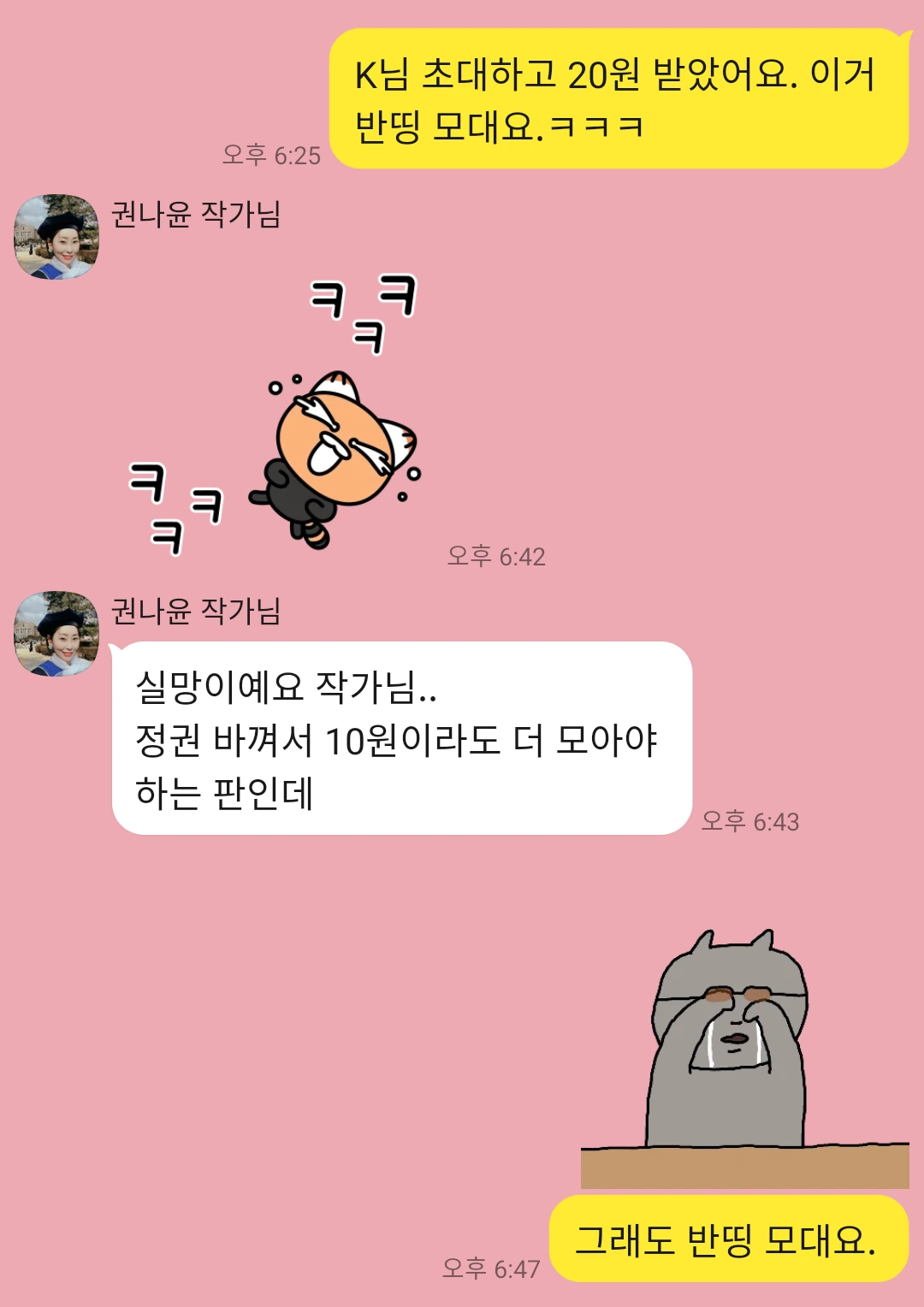 “실망이에요 작가님.. 정권 바뀌어서 10원이라도 더 모아야 하는 판인데”