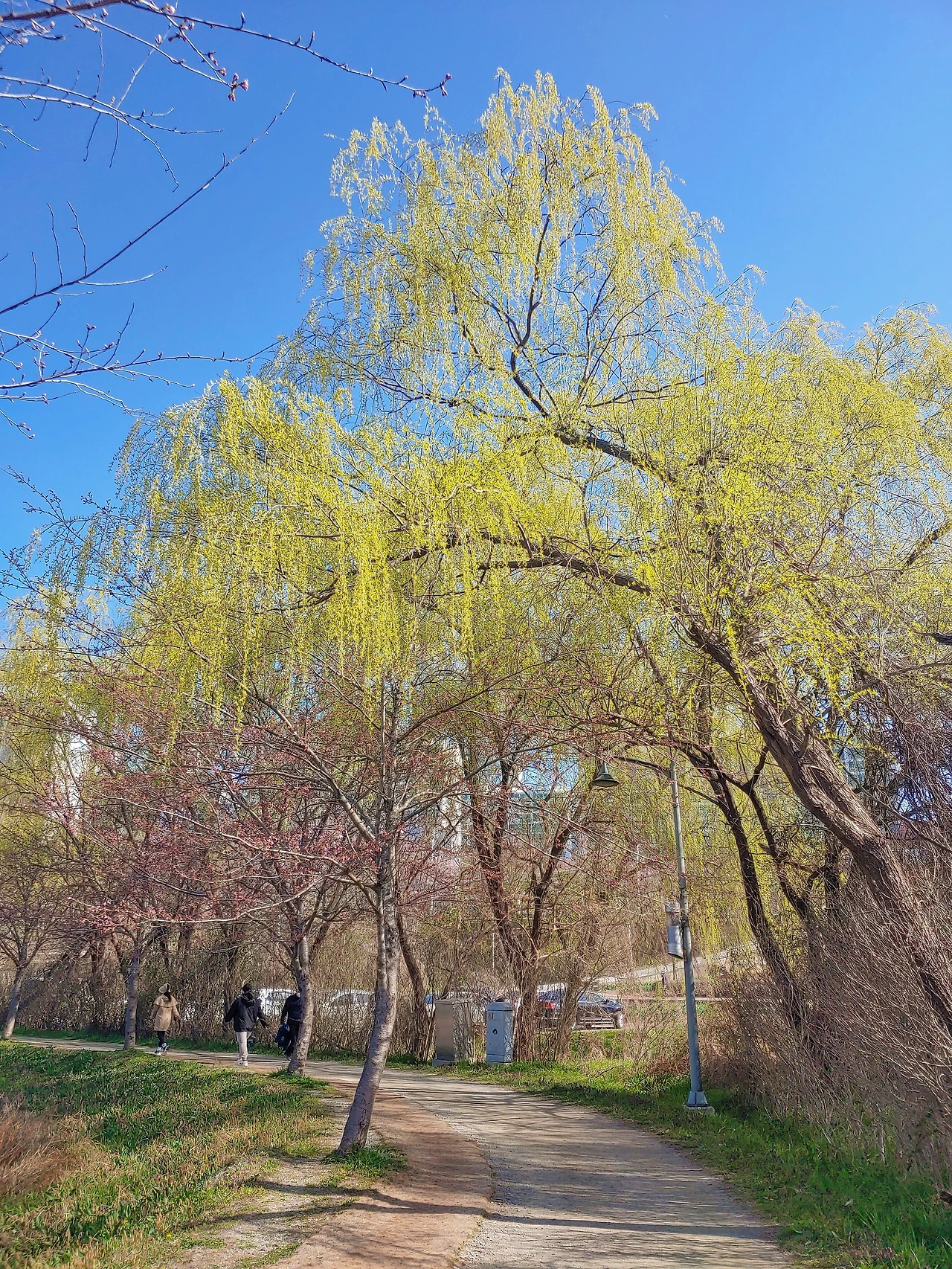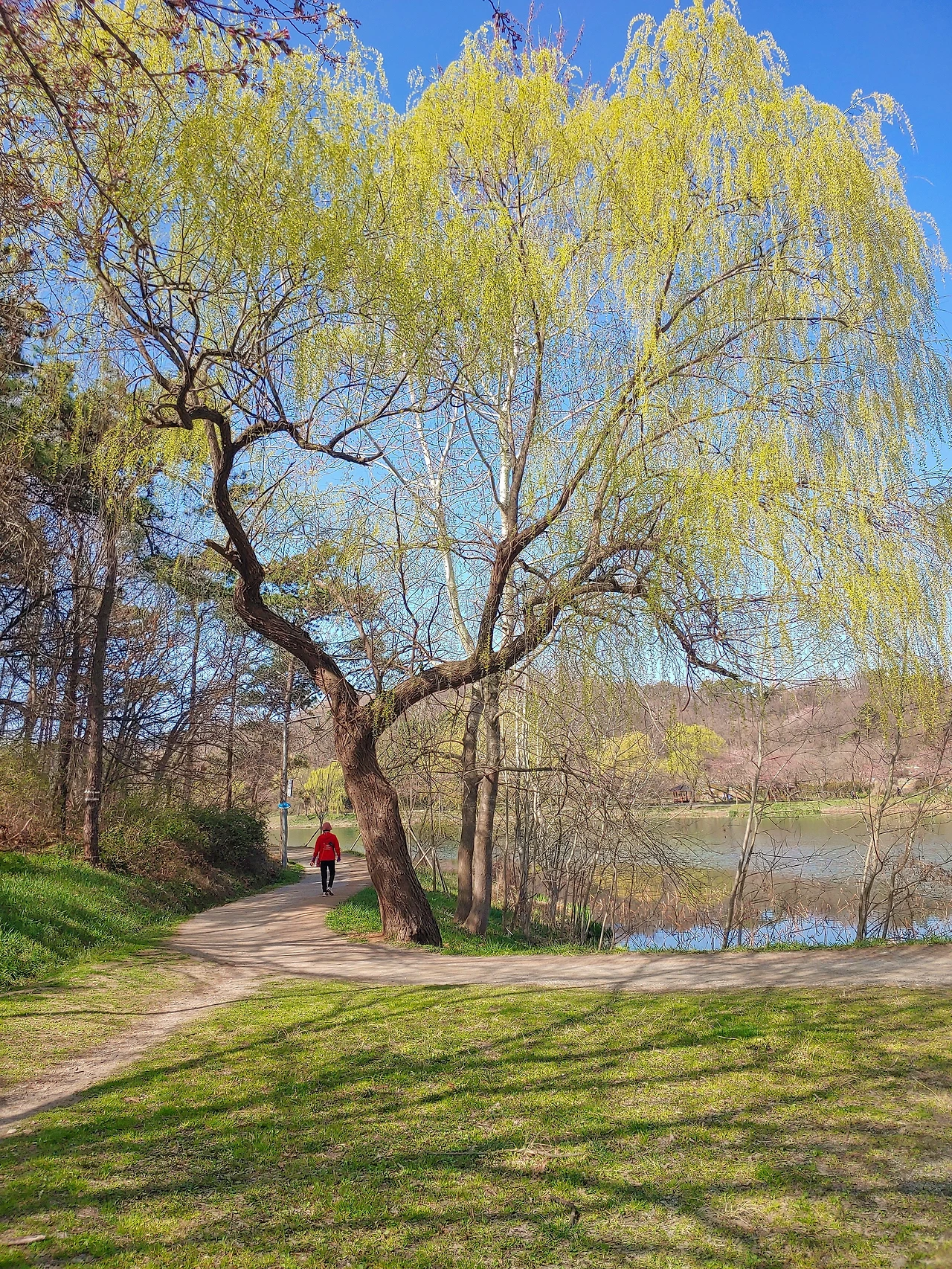 오늘 옛생각이 난 건 수양버들 덕분이다. 우리나라에서 꼴찌로 꽃 피려고 작정한 것 같은 은파의 벚나무들 사이에서 늠름하고 멋지게 서 있는 수양버들. 어릴 때는 동백꽃나무하고 수양버들나무를 ‘전설의 고향’만큼 무서워했는데 지금은 아름답다고 감탄 100번씩 한다. 세상에서 가장 아름다운 곳을 통과하는 것처럼 마음이 부풀었다가 집에 온다.