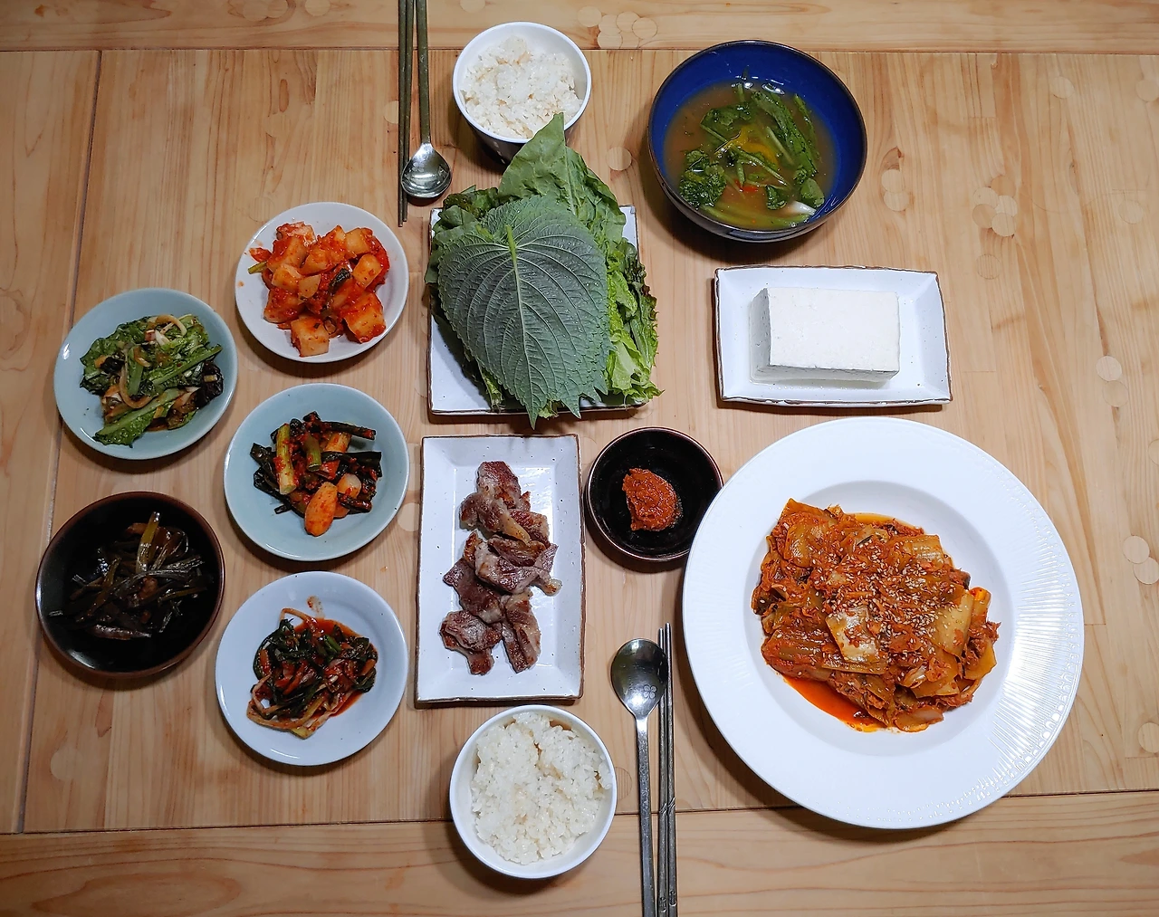 강성옥씨와 둘이서만 맞는 고요하고 덤덤한 일요일 아침. 메뉴는 열무 물김치, 두부김치, 양파김치, 파김치, 마늘종 볶음, 상추 겉절이, 고기 몇 점, 상추 많이. 강썬이 독립하고 나면 우리 부부가 먹게 될, 지지고 볶은 음식이 별로 없는 ‘미래의 밥상’이었다. 아내한테만 엄격하게 식사 지도를 하는 강성옥씨는 고기 안 넣은 탐스러운 내 상추쌈을 지적했다.